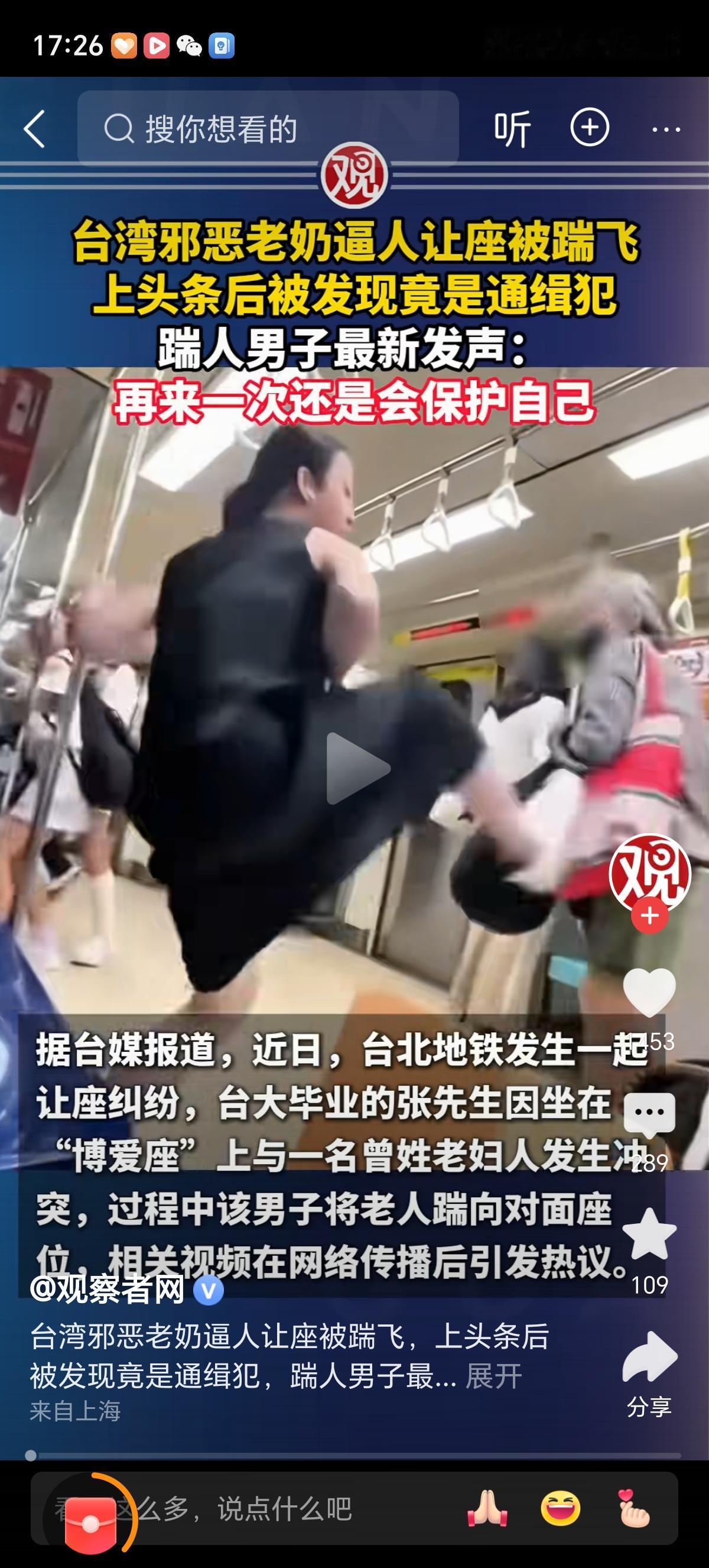 你愿意给那些变老的坏人让座吗?女装大佬一脚踹出个通缉犯,这是立功了吧?通缉犯是个老太太也是立功了,老太太还说女装大佬太可怕了,她咋好意思说的。 女装大佬说老太太打向他的包包里是有挂衣服的钩子的,把人打疼了才踹老太太一脚的。 通缉犯老太太欺负人欺负惯了,以为是个弱女子,就道德绑架人家让座为,看人家不动还打人,结果没想到弱女子变身壮汉,直接开踹,这是遇上硬茬子了啊。长年欺负人,终于踢到铁板了,也算报应不爽。