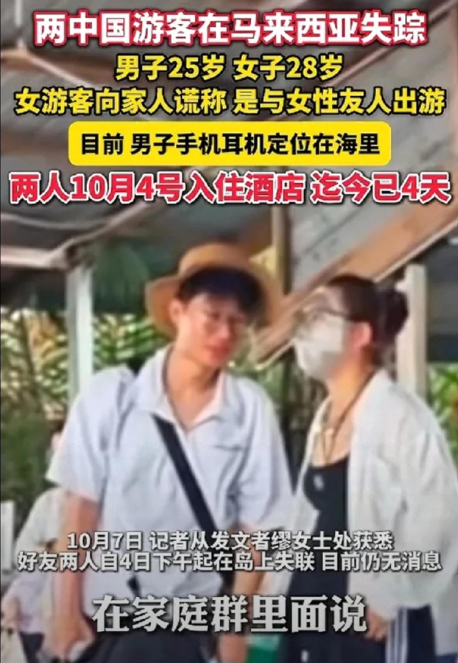 28岁的中国女子向家人谎称和闺蜜去马来西亚旅游,实际上是和一位25岁的中国男子前往马来西亚游玩,结果谁也没想到会发生意外。 从出发到抵达马来西亚,甚至是去哪个景点游玩,女子几乎全程都有向家人报备,直到彻底断联,父母就接到了女子失联消息的电话。 这事儿就发生在马来西亚沙巴州的美人鱼岛,俩人10月4号住进当地度假村酒店,行李都好好放在房间里,人却没了踪影。监控拍到他们下午4点半穿着泳衣离开酒店,之后就没了任何踪迹。女生出发前还跟好友说,怕爸妈担心才撒谎说是跟闺蜜同行,其实她和那男生是认识一年多的好朋友,俩人事先一个月就订好了行程。 男生朋友后来回忆,失联前一天男生还提过,第二天可能去浮潜、看日落或者玩桨板。大家顺着男生平板的定位找过去,发现手机最后信号出现在海域深处,蓝牙耳机一个在市区,一个还飘在海上。当地警方立马带着潜水员下海捞手机,可惜一直没找到。 女生的爸爸和姐姐急得赶紧飞到当地,可偏偏遇上风浪大,根本上不了美人鱼岛,只能在岸边干着急。中国驻当地总领馆也出面了,总领事专门去见了警方负责人,催着他们加大海空搜索力度,一定要尽快找到人,还得查清事故原因。 说真的,马来西亚海边这些水上项目看着好玩,风险可不小。驻当地领馆之前就提醒过,浮潜、体验潜水这些项目得特别小心,不光得确认教练有资质,自己身体不舒服、天气不好的时候千万别硬撑着出海。这俩人出事那几天,当地正好老下雨,海况本来就差,搜救都受影响。 好好的一趟旅行变成这样,家里人得多揪心。要是一开始没瞒着家里,或许沟通起来能更及时,可现在说啥都晚了,只能盼着搜救能有好消息。 各位读者你们怎么看?欢迎在评论区讨论。马来西亚