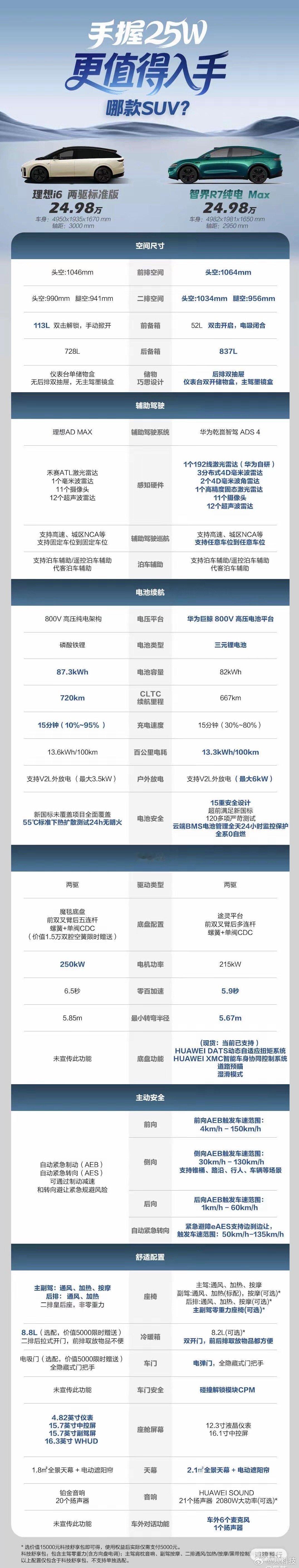 理想i6和智界R7参数对比。智界很多方便都很强大,但理想i6国庆订单更多。同样的