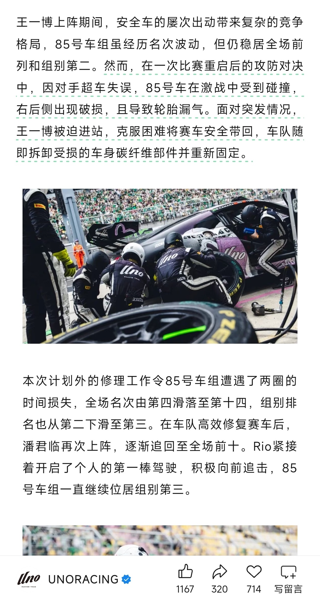 Uno Racing车队发长文,总结85号车组在上海八小时耐力赛的表现,对85号车碰撞受损的原因,明确定性为“对方超车失误”!业内都懂这次事故的责任在谁!