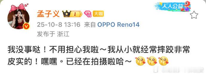 孟子义拍戏不小心摔倒第一反应是笑着安慰同事[泪奔][泪奔][泪奔]微博上线也是第一时间在同事微博下安慰,孟孟太体面了[期待][期待][期待]东北人骨子里的皮实