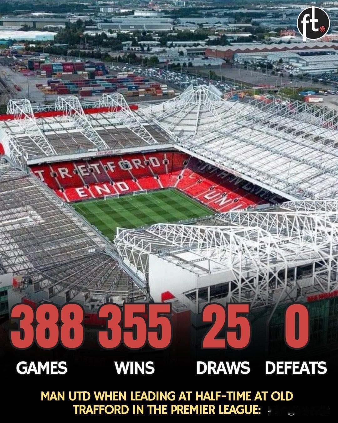 英超联赛中,曼联在老特拉福德球场半场领先时: ▪️388场比赛 ▪️355场
