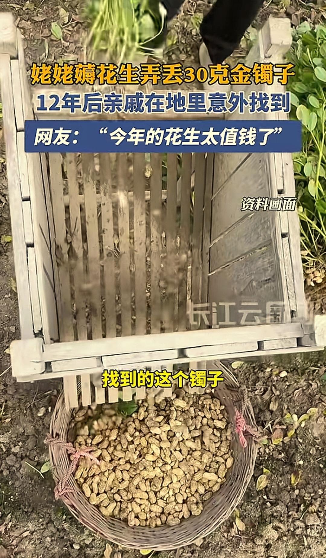 这感情比金子还真!姥姥12年前在地里薅花生掉落的金镯子,竟然被亲戚找到了!网友:这亲戚绝对值得深交! 事情发生在河北唐山,12年前,姥姥来帮赵女士家收花生,不小心把金镯子弄丢了,家人亲戚帮着找了好久,都一无所获,只得作罢。后来她家这块地自己不种了,让亲戚来种,但今年还是种的花生。 前几日刨花生的时候,竟然意外地找到了金镯子。12年的时间,黄金价格翻了几倍,算下来30克的金镯子价值三万多,这块地里的花生不是一般的值钱啊! 重点是这个亲戚,发现价值几万的金镯子,没有自己藏起来兑换掉,直接还了回来,这亲戚之间的感情,比金子还真啊! 从视频看上去,埋在地里12年的黄金,虽然变形,却依然闪耀着金黄色的光芒,似乎在诉说着真金不怕火炼的真心! 有网友说,这种亲戚估计全世界都找不到第二个! 还有网友说,你家地会理财,金价低的时候种进去,金价最高点它长出来了! 这枚重见天日的金镯子,不仅依然闪耀着黄金的光芒,更是映照出了比黄金还珍贵的人心。 十二载春秋,虽然金价在变,人与人之间的那份厚道与真诚依旧没变。为这样的亲情点赞!
