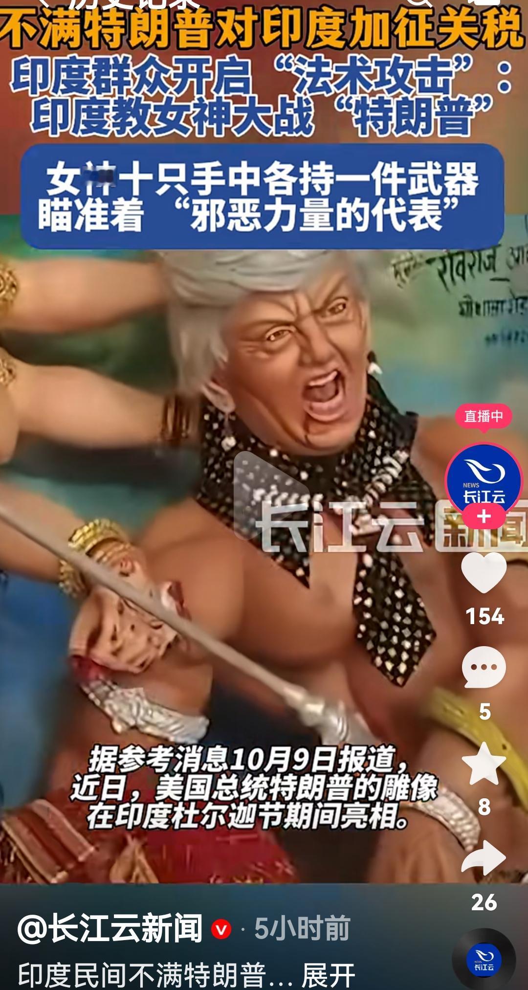 印度又对特朗普使法了,特朗普这次招架不住了 根据印度媒体报道,10月9日特朗普的雕像在印度杜尔迦节期间亮相 印度教女神大战特朗普 印度民众对特朗普使用法术攻击 印度女神杜尔迦手持十个武器瞄准邪恶力量特朗普 特朗普这是遭遇巫蛊之术啊,特朗普估计这几天要病加州反特朗普 特朗普封杀哈佛 日本特朗普 印度反制特朗普 图片来自长江云新闻视频