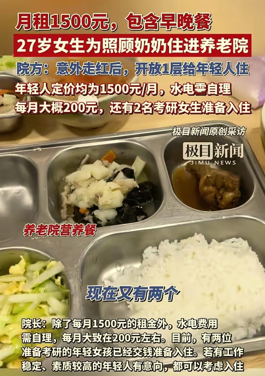 真是个好主意!27岁女生跟奶奶一起住进养老院,本来为了方便照顾奶奶,却意外引来一大波年轻人羡慕! 在一般人看来,去养老院的老人,要么是没人照顾,要么是为了找人陪伴,压根跟年轻人不挂钩。 然而,浙江的一个女生打破了这一传统,她为了陪伴照顾奶奶,27岁的她跟奶奶一起住进了养老院,有独立的房间,一个月只需要付1500元房租,包含早餐和晚餐,这可比年轻人天天点外卖划算,营养丰富还健康,加上水电费,也就2000元左右。 而且养老院离女生单位很近,方便上班,养老院还清静,绿化好,空气清新,鸟语花香,真的是一举多得! 女生把自己的生活分享到了网上,引起了一大波年轻人关注。一下子带火了养老院。这个条件,着实吸引现在压力重重的年轻人。现在已经有两个准备考研的女孩准备交费入住了。 养老院院长是一个头脑灵活的人,发现年轻人入住需求背后的商机后,马上打算将其中一层开放给年轻人入住,并且开启了对老年人和年轻人共同入住模式的探索之旅。 网友们也纷纷表示,如果当地有的话,自己也想去。 有个网友说,1500包吃住,比自己买房划算! 也有网友说,挺好,每天奶奶还会给她叠被子、打扫卫生、打饭。 还有网友说,这种方式值得推广!亲属住附近让老人更有安全感。 相对比只有老年人的养老院,年轻人一住进来,气氛很快就活跃起来了! 如果老人有家人陪伴一起入住,既能享受亲情,还能享受养老院全面照顾,这也太方便了。 不得不说,这个模式值得好好完善,尽快在全国推广,让更多的老人和家属以及有需求的年轻人,都能共享这一美好空间! 想问下大家,你们那里已经有这种养老院模式了吗?