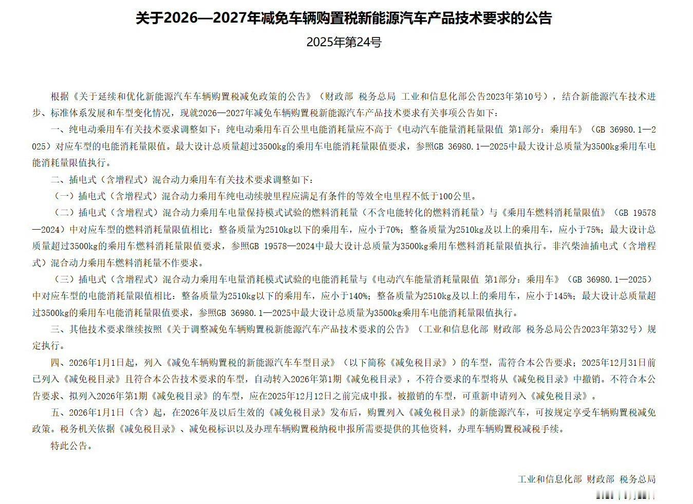 新能源车购税减免门槛进一步提高此次三部委联合提高新能源车购置税减免的技术门槛,标志着政策导向从“普惠”转向“扶优扶强”,为了淘汰低端落后产能,倒逼企业进行技术升级,推动新能源汽车产业向高质量、高技术方向发展。长期来看,这有助于优化产业结构、提升国际竞争力,并将最终为消费者带来更优质、更可靠的产品选择。阿远说车