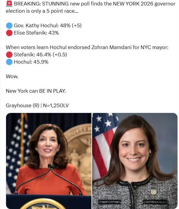 最新民调,纽约州2026年州长选举的差距仅为5个百分点…… 州长凯茜·霍楚尔:48%(+5) 伊丽丝·斯特凡尼克:43% 当选民得知霍楚尔曾支持佐兰·曼达尼竞选纽约市市长后: 斯特凡尼克:46.4%(+0.5) 霍楚尔:45.9% 纽约州可能成为“战场州”。