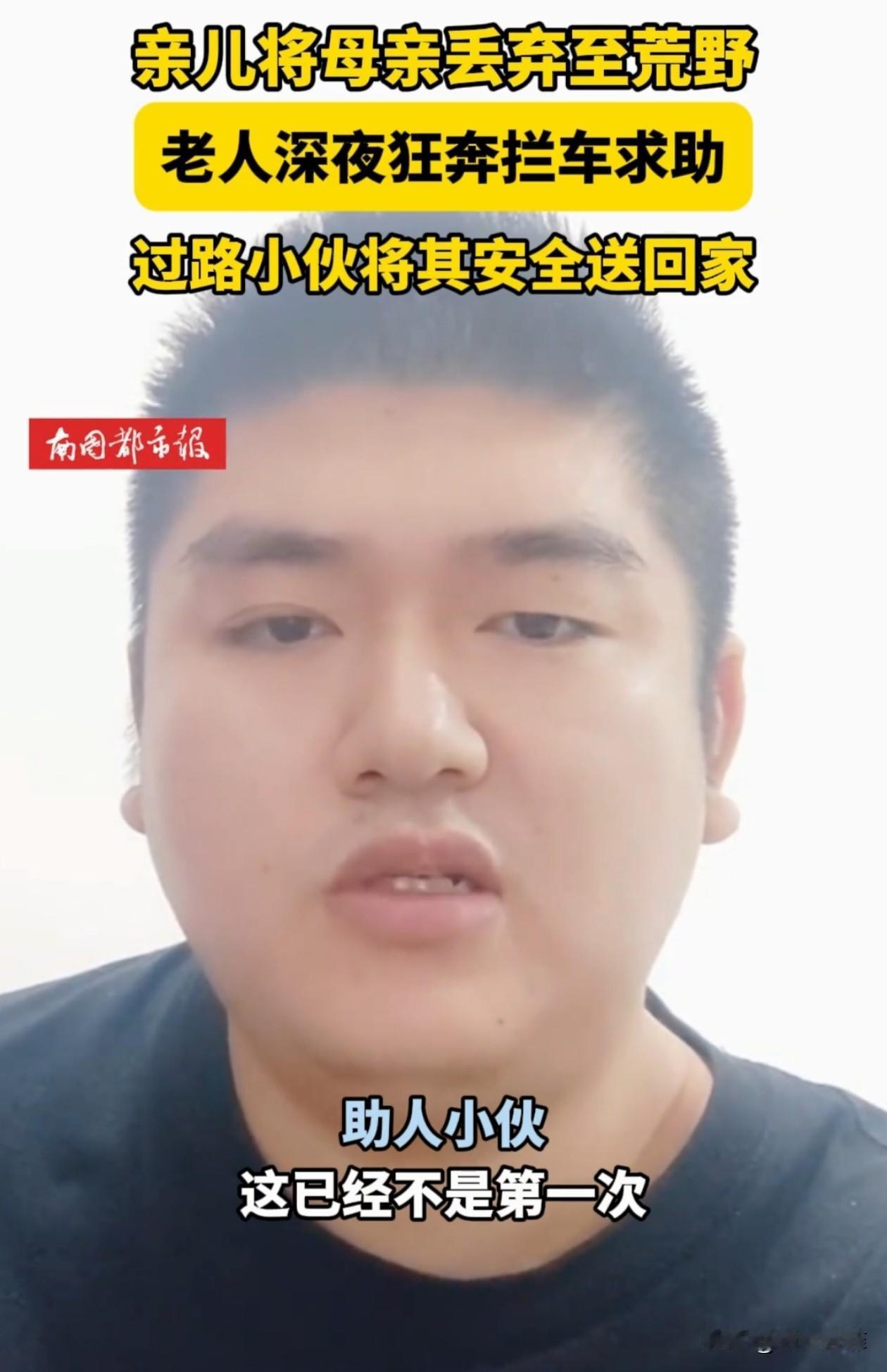 一母亲和儿子闹脾气,被儿子骑车丢弃在荒郊野外,还是凌晨,周围又黑又没人,母亲只能狂奔拦路过的车求助,最后一个好心小伙把她送回了家。母亲哭诉:已经不是第一次了。 河南,凌晨的荒郊野外,一位北京的母亲特别着急,一边跑一边拦车,见到路过的小伙哭着上前求助,她说“把我带到有灯的位置,我害怕。” 小伙把她安全送回家之后,才从她的哭诉里知道,这不是儿子第一次这么做了,之前也因为闹矛盾,被儿子丢在过荒野,这次又是不管不顾地扔下她走了。 都说养儿防老,结果这位儿子却把母亲扔在荒郊野外,这样的行为非常不孝顺且不负责任。 不管有多大矛盾,父母把我们拉扯大不容易,再怎么样也不能这么对待他们。 河南小伙只是个陌生人都愿意伸手帮忙,亲儿子反而这么狠心,对比之下太讽刺了。 善待父母不是口号,是最基本的义务,有什么事都可以好好沟通,不要轻易伤了父母的心。
