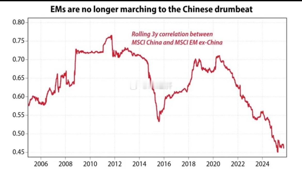 Gavekal Research:中国股市与其他新兴市场的联动性正迅速减弱,MSCI中国指数与MSCI新兴市场(除中国外)指数之间的三年滚动相关性已从2021年的高点持续下滑,目前已降至近二十年来的最低水平。