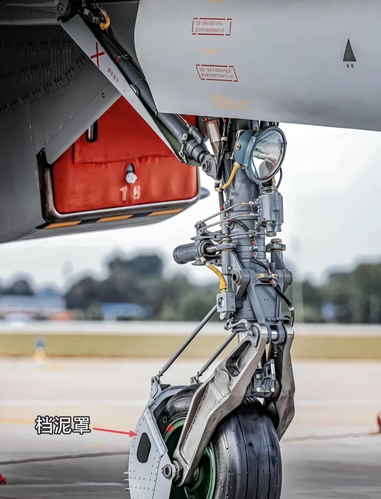 航展上重型战机的前起落架可以快速分辩出是空军陆航机型还是海军舰载机型,通常一个轮胎的是陆航机,而双轮胎的则是舰载机。 照片为歼-11B的前起落架,这种立柱式起落架液压缸体与主立柱和支撑连杆锻件必须要万吨级模锻液压机才能制造出来,否则无法承受降落时巨大的冲击力。 图片上可以看到前起落架轮胎后也有类似摩托车轮胎挡泥板的罩子,目的是防止跑道上的异物被轮胎高速打到机身上,造成不必要的损坏。在前起落架的轮胎上可以清晰地看到排列有序的孔洞,那是观察轮胎磨损程度的观察孔。仔细观察轮胎主轴部件,发现并没有刹车装置,而歼-11B的两个主起落架轮胎是有刹车装置的。 据了解,飞机着陆时,主起落架(两个后轮)需要承受大部分冲击力,并通过其机轮刹车装置产生巨大的摩擦阻力来使飞机减速。战斗机普遍采用前三点式起落架(即前轮+两个主轮),刹车时飞机重心前移,主轮对地面的压力(即结合力)会增大,这意味着主轮能提供更有效的刹车力。前轮在刹车时受力较小,若强行安装刹车并猛烈制动,反而容易因摩擦力不足导致跑偏或偏离跑道。 而实际上,战斗机在降落时,并非单靠机轮刹车来减速,而是会综合运用多种措施。 首先是气动减速,包括减速板(增加空气阻力)和襟翼(改变翼型,增加阻力和升力控制)。某些战机发动机装有反推装置,通过改变气流方向来辅助减速。而最主要的减速手段,由主起落架上的刹车装置完成的。 也有不少机型拥有减速伞(部分机型:如一些俄系战机),战机在触地后机尾抛出一个减速伞来增加空气阻力,使飞机减速。 看到这张超清晰的照片你可能还会好奇,战斗机有没有手刹?告诉大家,战斗机没有手刹!那么,没有手刹的战斗机,在地面停靠时如何防止溜车? 它们依靠的是在机轮下放置轮挡来固定。战斗机上的刹车系统主要用于起飞和着陆过程中的制动,而不是像汽车手刹那样的驻车制动。