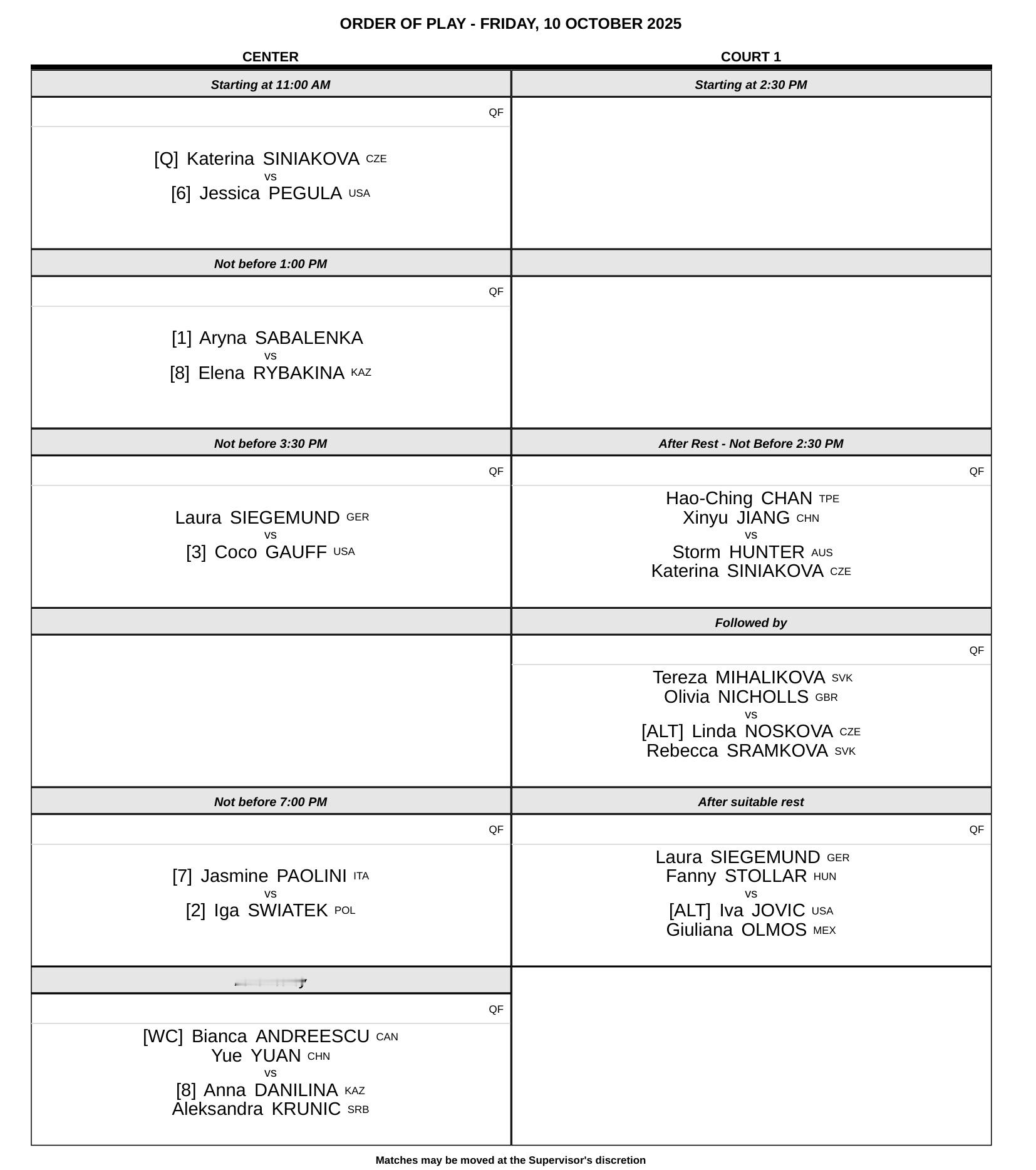 1/4决赛挥拍,萨巴伦卡再战莱巴金娜,斯瓦泰克对决鲍里妮,高芙、佩古拉也将亮相。袁悦组合、蒋欣玗组合出战双打。