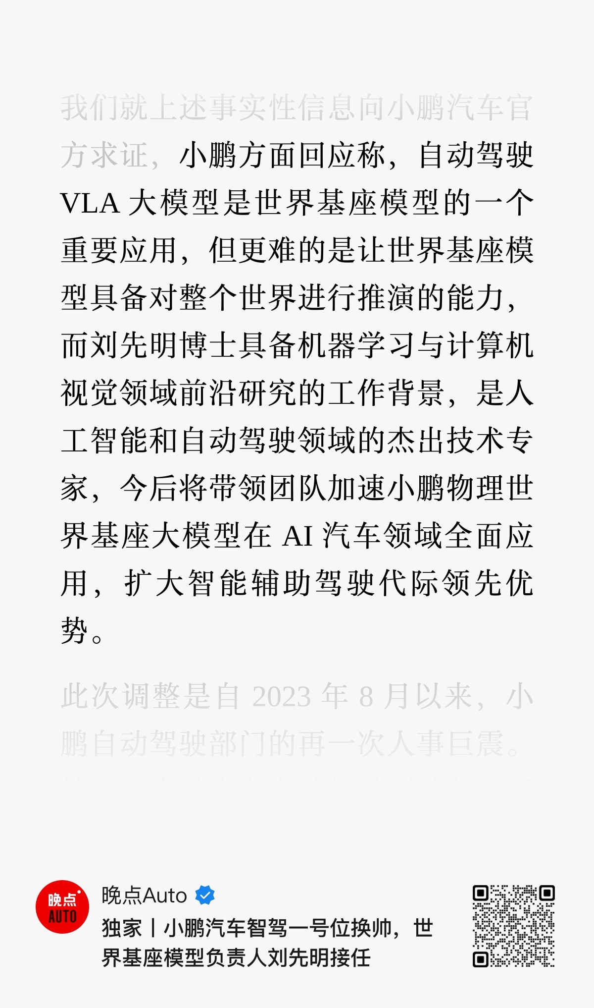 晚点报道,小鹏智驾一号位李力耘,不再担任自动驾驶中心负责人,世界基座模型负责人刘先明(Xianming Liu)接替该职位。