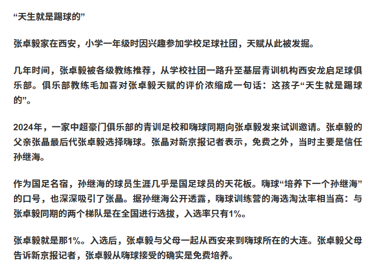 几个月前,小球员张卓毅的家长与孙继海的青训项目“嗨球”就解约要266万元天价青训
