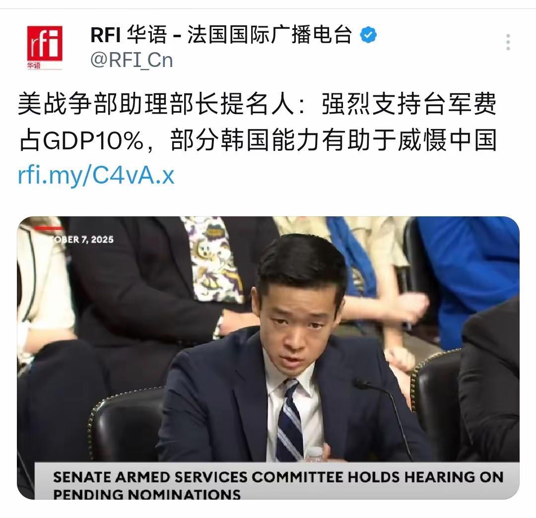 外媒10月8日晚报道:“美战争部助理部长提名人:强烈支持台军费占GDP10%,部分韩国能力有助于威慑中国。美国战争部印太安全事务助理部长提名人约翰·卢(John Noh)周二在出席国会参议院确认听证会时表示,强烈支持特朗普总统关于台湾国防支出应占其GDP10%的主张。” 有网友评论:特朗普这老头真喜欢指挥别人,要欧洲提高军费到GDP5%,现又要求台湾军费到GDP10%!估计欧洲也好,台湾也罢,都不会听他的!台湾提高到10%,地球人都知道除了浪费人民税金外毫无用处! 我来翻译,你们让我当这个官,我就让台湾再拿一大笔钱出来,各位可以一起搓圆仔汤,不用担心我们一起分这笔钱会真的影响到地区的安全,旁边的韩国还有一些威慑力,我话讲完,谁支持,谁反对? 对此,你怎么看?