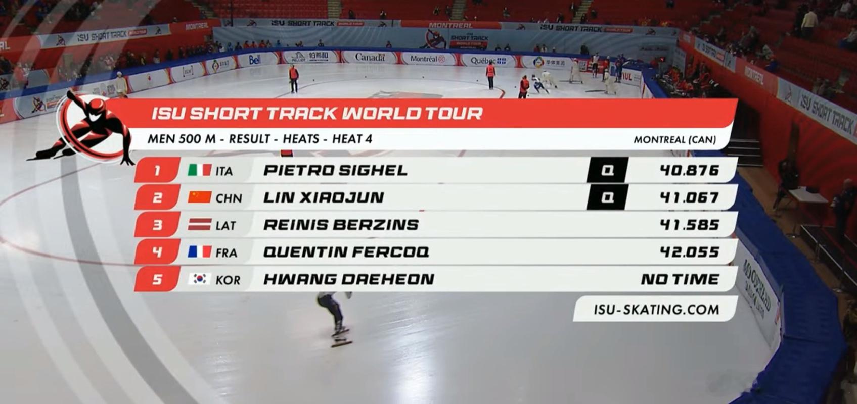 最终西格尔40秒876小组第一,林孝埈41秒067小组第二,两人晋级四分之一决赛。