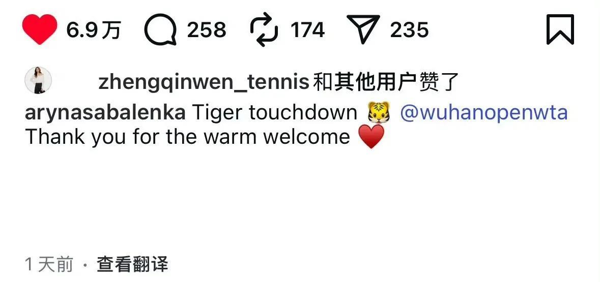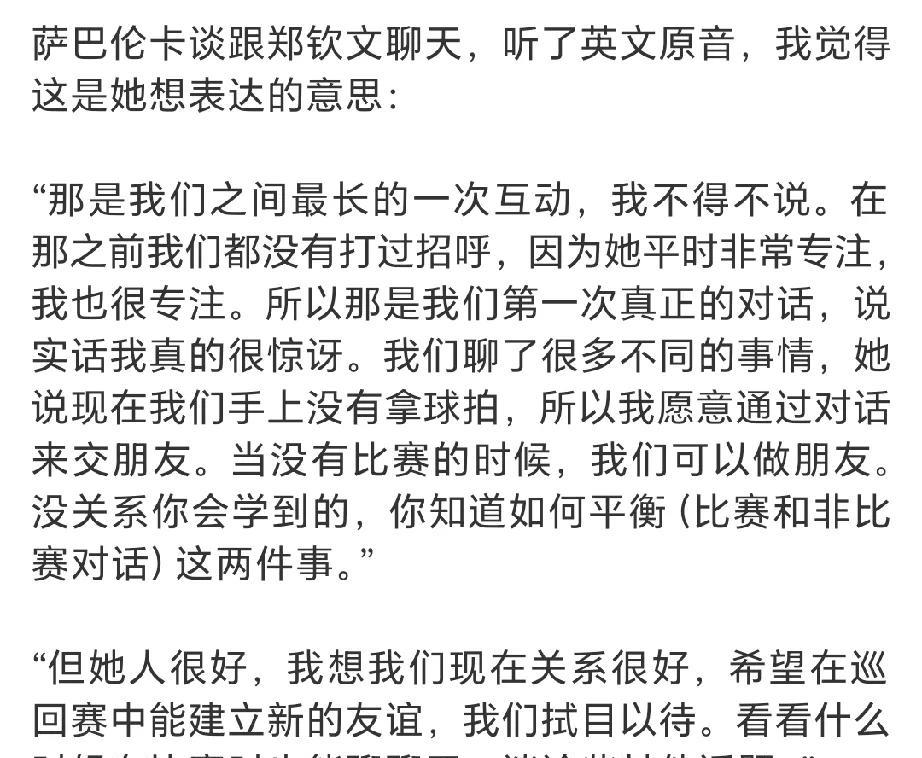 哇哦,文文和萨巴不仅在ins上互关了,而且还互相点赞。 从之前的“巡回赛上不交朋友”,到武网开幕式上对萨巴说“没有比赛的时候我们可以做朋友”,文文的观念有所变化了。 可能这一段时间休息带来的生活体验让文文整个人更松弛了。 也可能随着年龄、阅历增加,文文变得成熟了,学会平衡对手和朋友、比赛和非比赛的关系。 无论怎样,都为不断成长的文文感到开心,希望她多交朋友,带着好心情和健康的身体重返赛场! #新锐创作者成长计划#