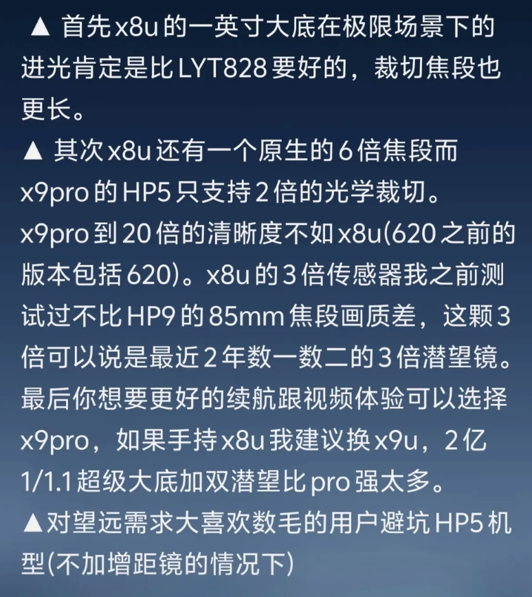 个人不建议x8u去更换x9pro,上面说的影像体验我再说说日常使用下来的一点,虽然x9pro的续航很顶但是80W的充电速度真的一般,x8u续航虽然中规中矩但是100W的充电速度是真的香。
