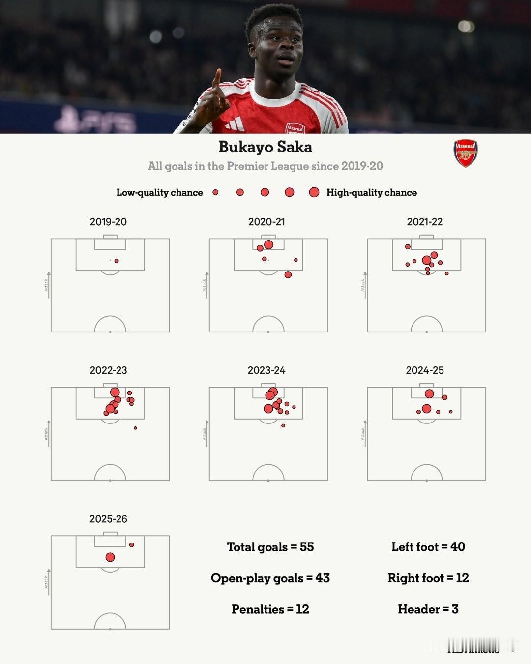 萨卡在出战的200场英超比赛中,已直接参与(进球或助攻)100粒进球。 图片非常清晰地展示了阿森纳球星萨卡在英超联赛的进球特点和发展轨迹。以下是对图片的详细解读: 1. 总进球数:自2019-20赛季升入一线队以来,萨卡在英超已攻入 55球。 2. 左脚进球:40球,占总进球数的 73%。这是最突出的特点,说明他的绝大多数进球都来自其擅长的左脚。右脚进球:12球。头球进球:3球。 3.运动战进球:43球占大头。这说明他的进球更多来自于球队的整体进攻配合和个人能力。点球进球:12球。这表明他已经成为球队指定的第一点球手,体现了教练组和队友对其脚法和心理素质的高度信任。 4. 进球位置分析:内切射门的经典范式。主要得分区域:几乎所有进球(包括高质量和低质量机会)都发生在禁区之内,这与他的技术特点完全吻合。 萨卡的进化之路:从一个助攻为主的边路新秀,成长为一个产量稳定、技术特点鲜明、承担关键责任的顶级攻击手。他的进球分布完美体现了一名现代内切型边锋的典型模式,并且其稳定性和可靠性正随着赛季推进不断增强。 对于阿森纳来说,萨卡在右路的内切左脚射门,是他们最致命和依赖的进攻武器之一。