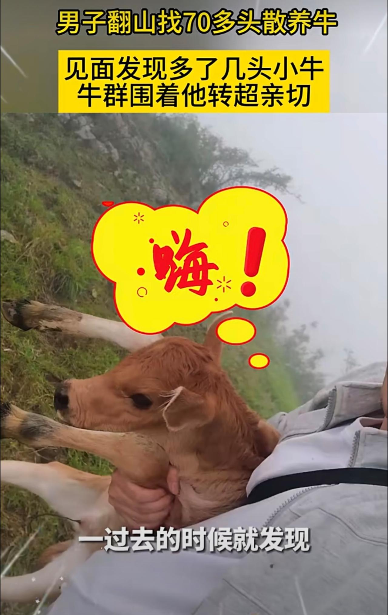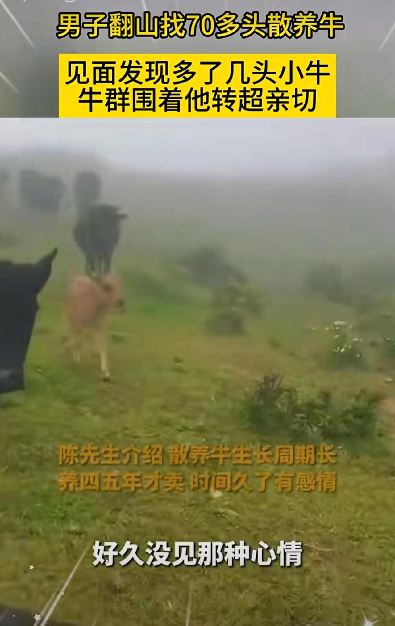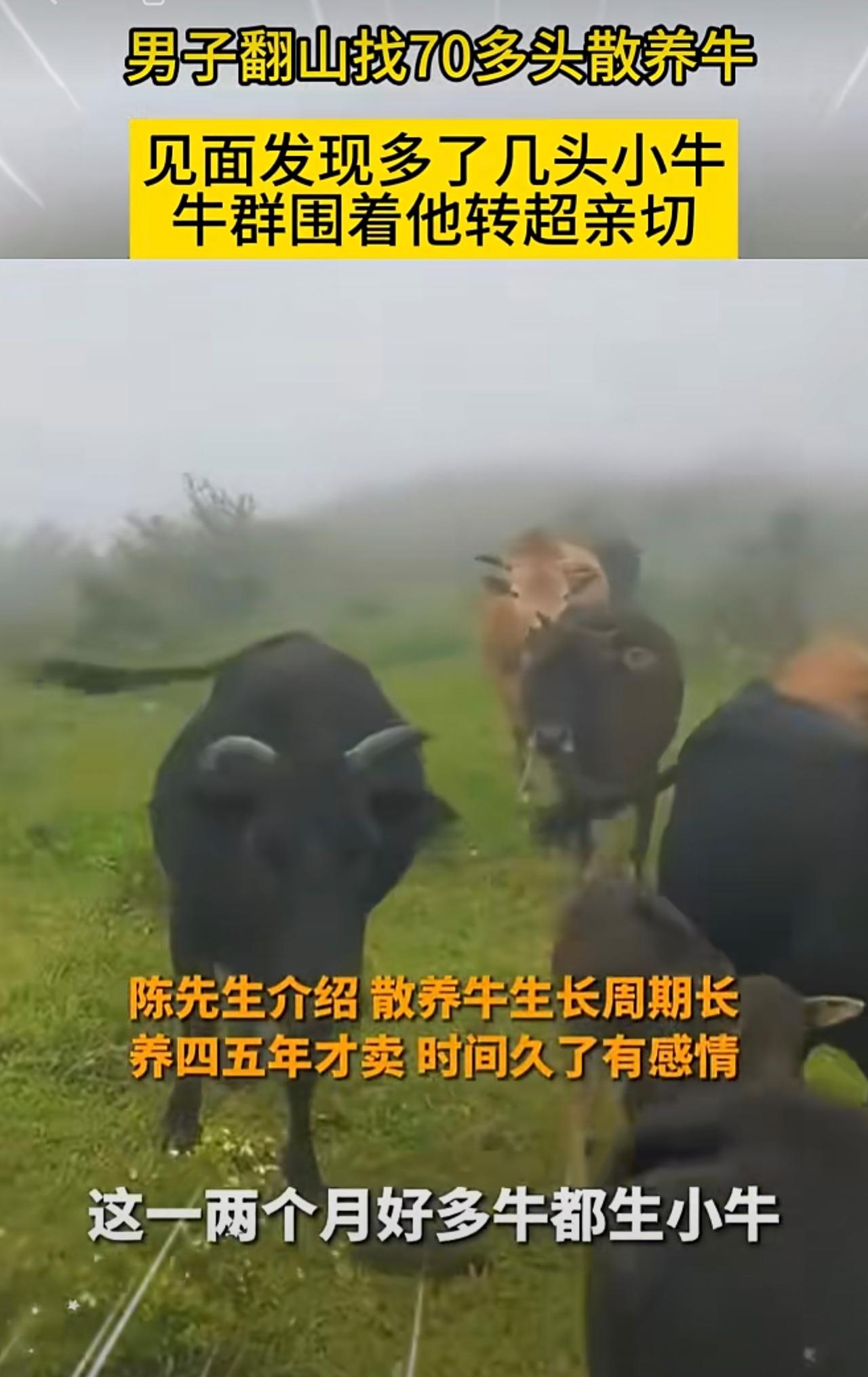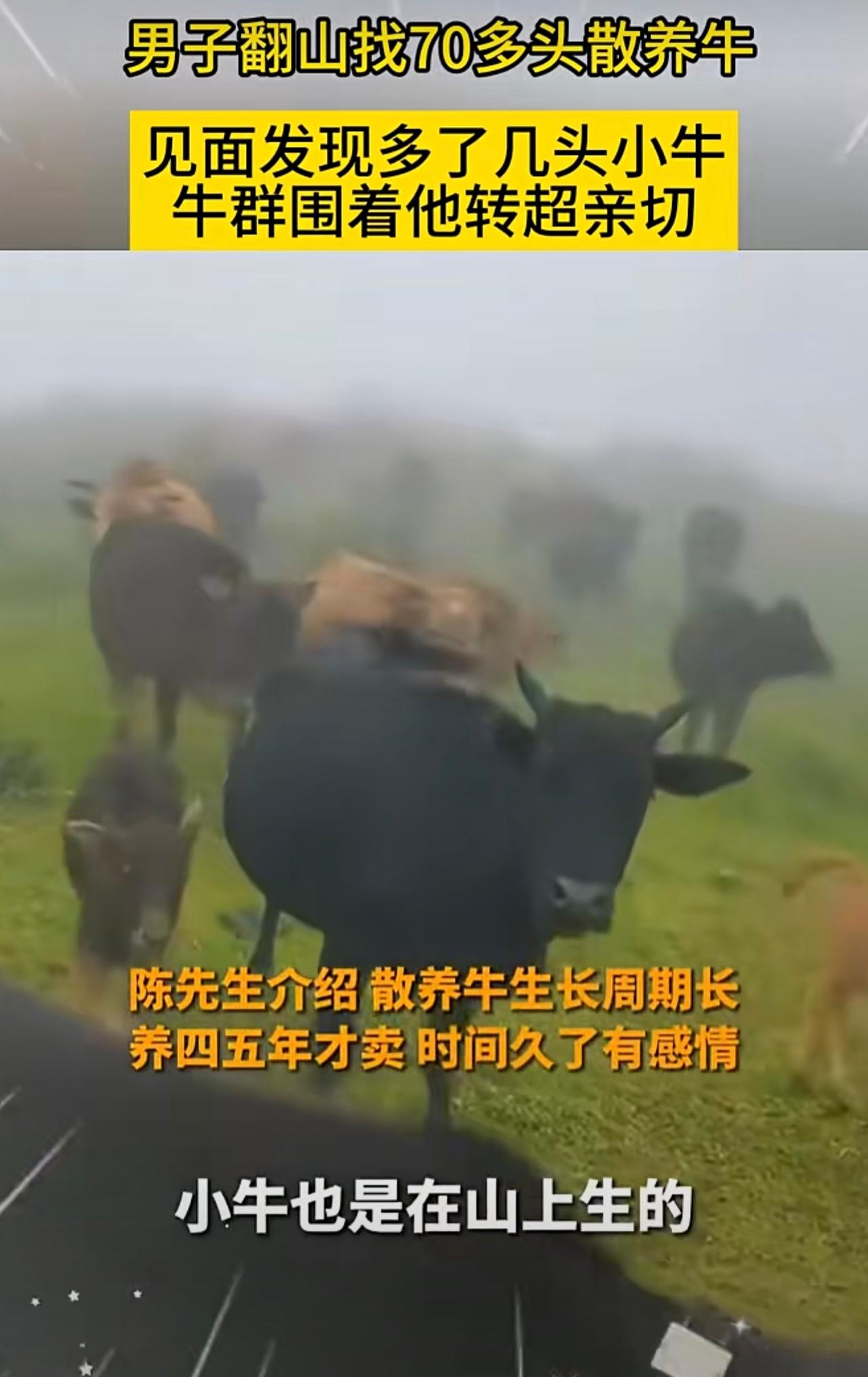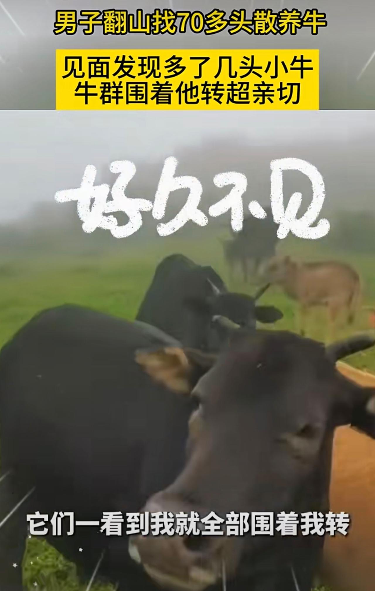 男子翻山找70多头散养牛,见面发现多了几头小牛,牛群围着他转超亲切。