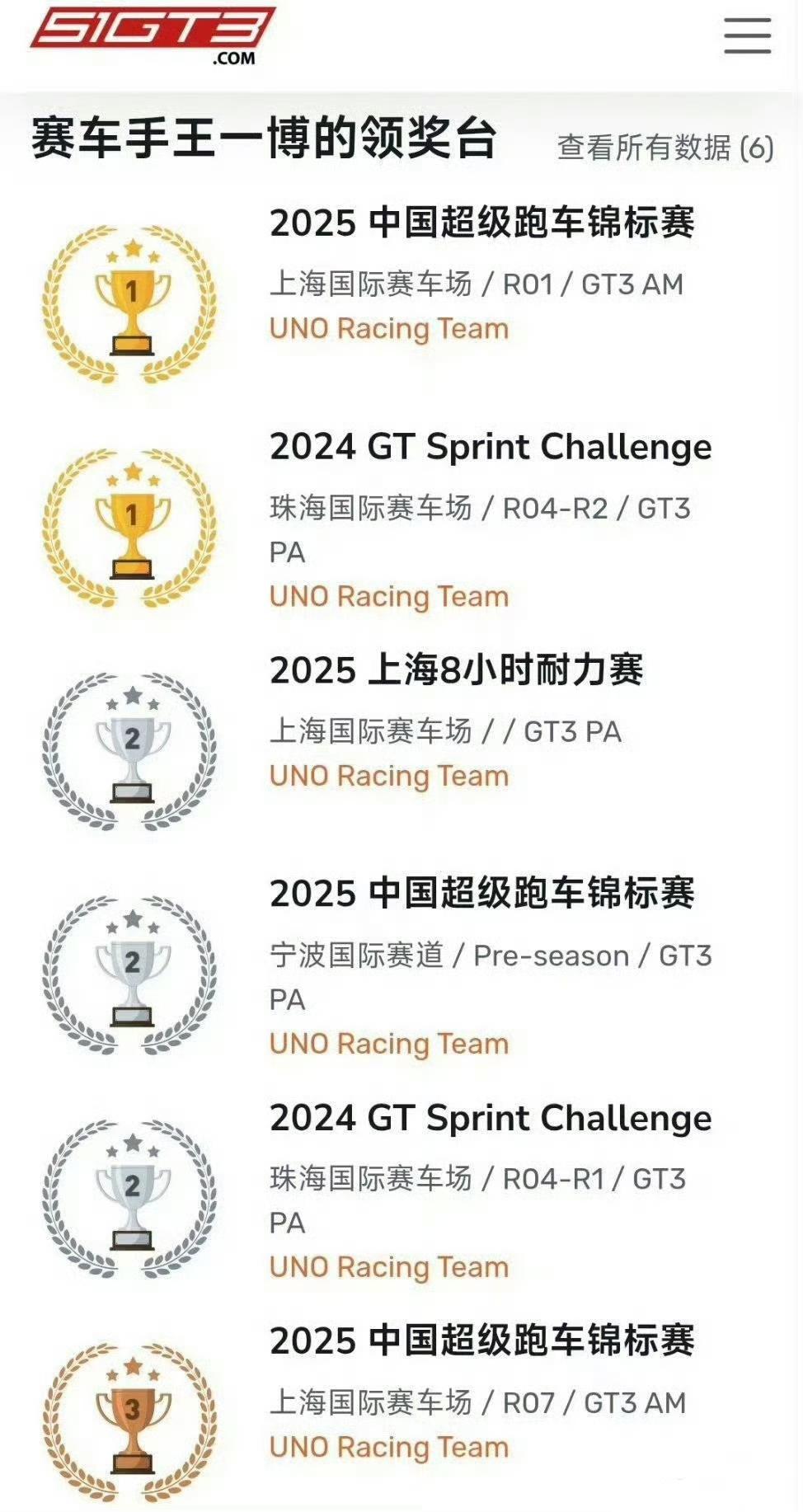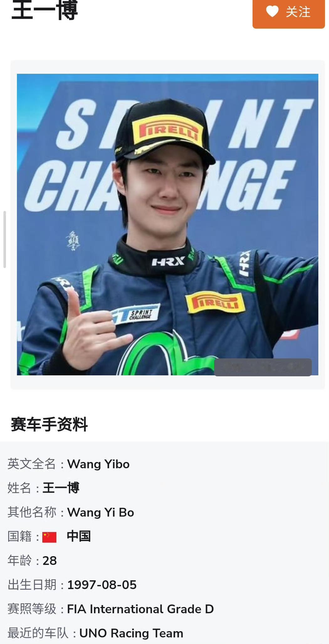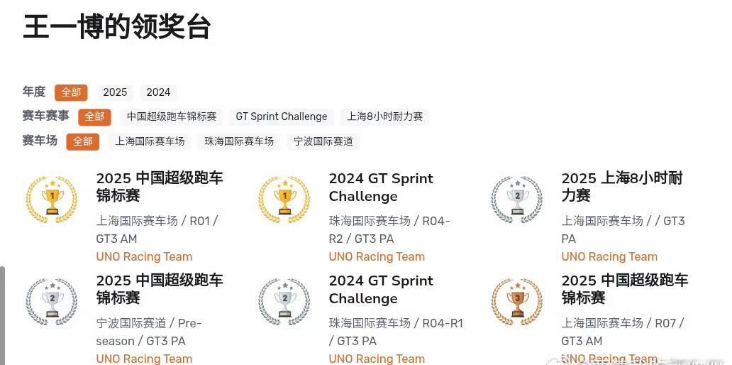 王一博在亚洲最大赛车网站51GT3车手档案又更新了! 新增了赛照等级:FIA International Grade D! 领奖台又添8小时耐力赛GT3 PA组别亚军🥈一枚[赞]!截止目前共完赛7次、颁奖台次数6次! 对于王一博来说,任何一项热爱都不是“玩儿玩儿”而已,而是真正的热爱就要全力以赴就要做到极致。 天赋加努力和超越常人的强大的心理素质,才成就了每一次都能站上领奖台的赛车手王一博[赞]。