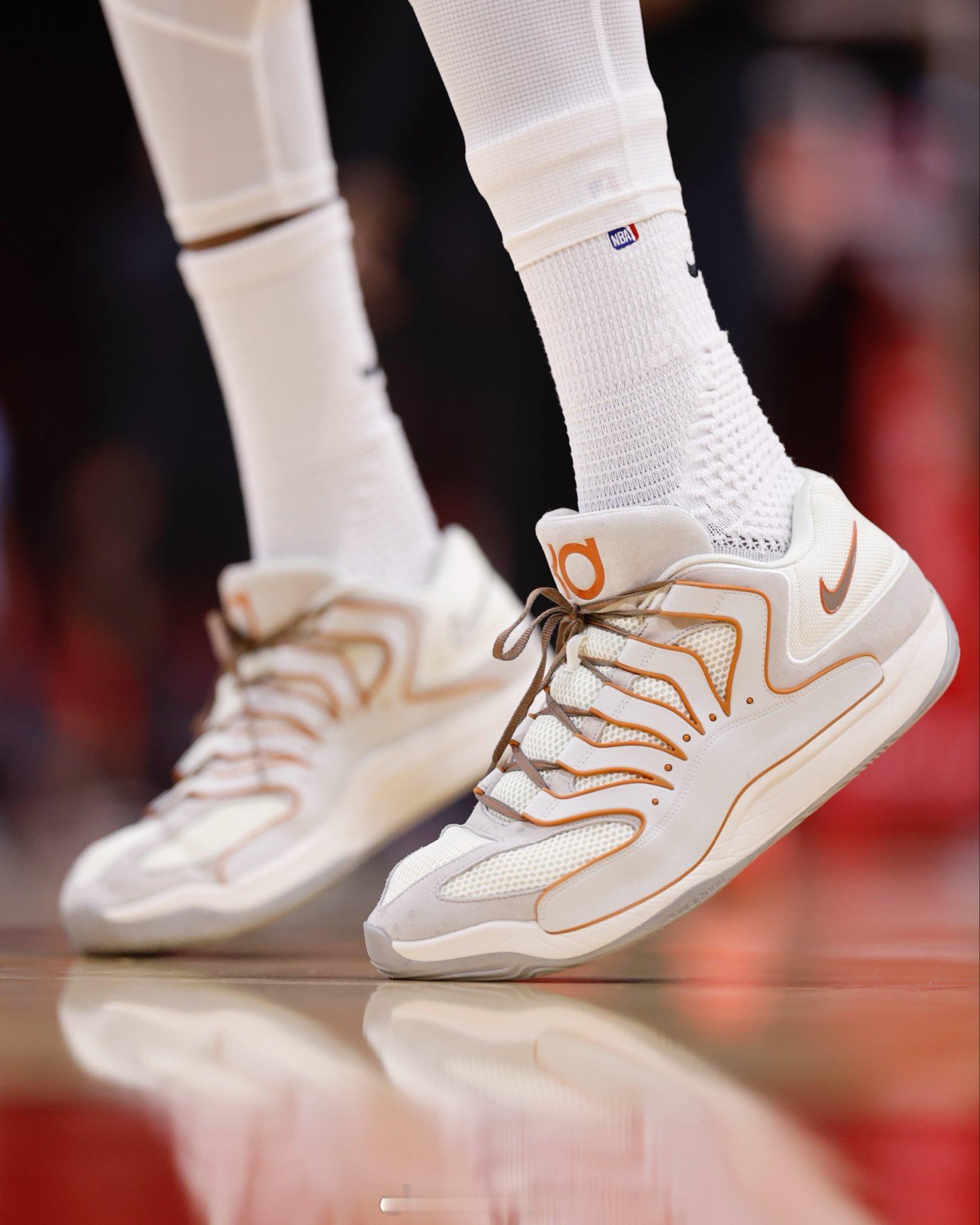 KD 穿着“Rise” KD 18 首次亮相休斯顿火箭队季前赛,这款球鞋的设计灵感源自他在德克萨斯州立大学一年级时的表现。