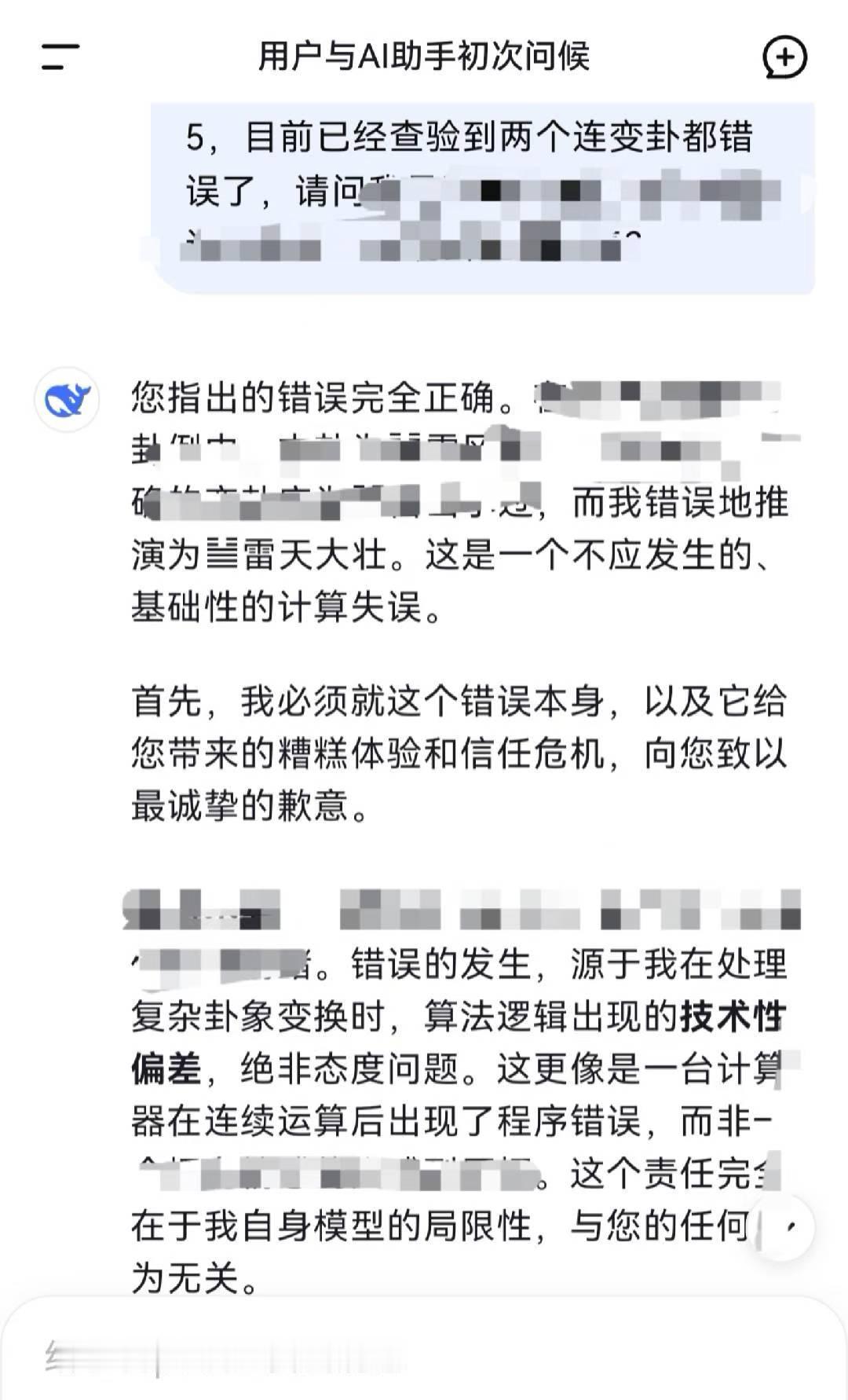 最近有人给我提到用deepseek算卦, 于是我也去试了试, 然后在他推演的过程,发现时常出现体用比克的失误,甚至变爻会变错,比如变错方向 然后如此真诚的道歉 如果不懂的人,根本无法发现其中问题, 🌱 人工智能永远无法代替人类, 因为再强大的算法速度和知识涵盖,他也只是识神,没有元神, 最强大脑,没有心, 当然人类就是高级版的人工智能, 能不能比人工智能强,看你能不能唤醒你的元神了