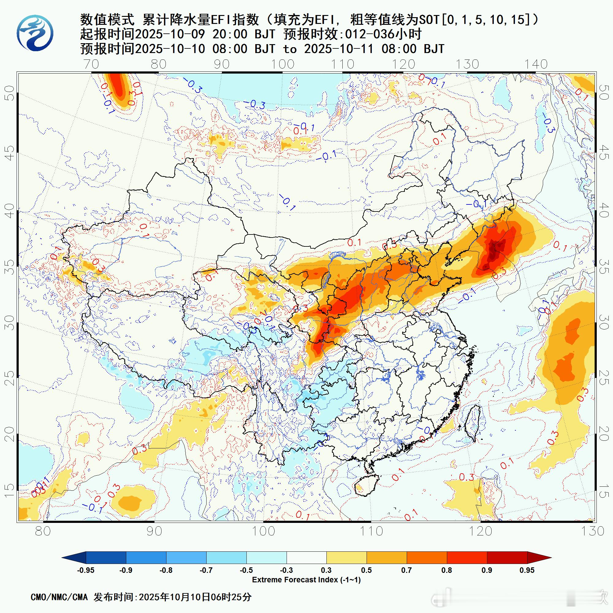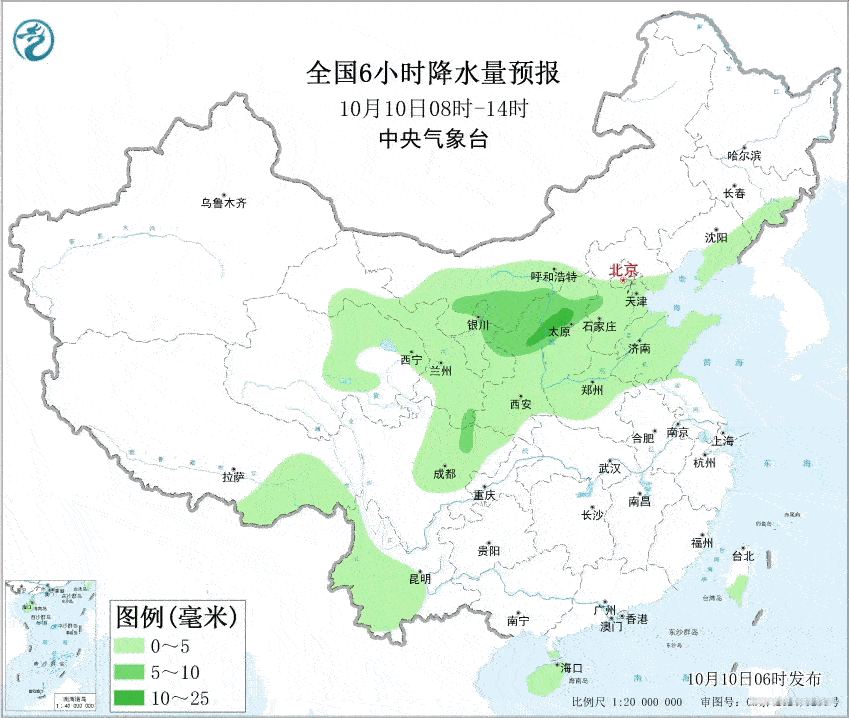 中央气象台今晨继续发布暴雨蓝色预警:预计,10月10日08时至11日08时,四川盆地西北部、甘肃东部和南部、陕西中部和南部、山西中部、河北中部等地部分地区有大到暴雨(50~90毫米)。四川东北部、甘肃东南部、陕西中北部的降雨强度,同期少见,局地可能破纪录。