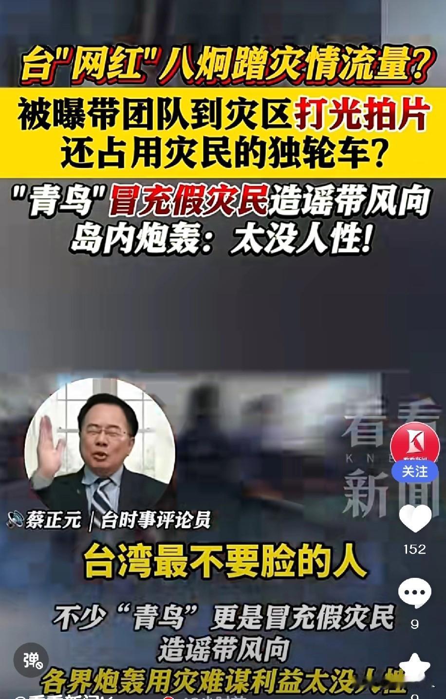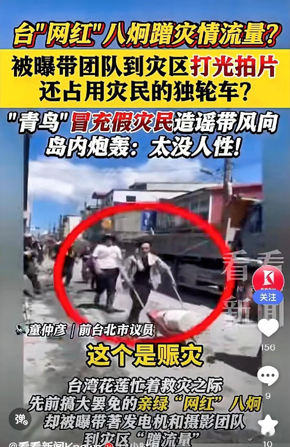 😡可恶...丑陋... 台湾亲绿网红-八炯,居然把灾难当成流量剧本 🎥扛着摄影设备,带着团队,跑到还在灾难中挣扎的莲花拍片“灾难片”! 更气人的是,还占用救灾工具-独轮车来装发电机。 甚至还有很多民进党支持者,冒充灾民,散布各种造谣,太没人性,太可耻了... 天灾面前,救灾才是重中之重 把灾难当成流量剧本的背景墙 心里只有政治,根本没有百姓 这种行为也引发了众怒: “用灾难谋政治利益,不要脸、没人性!” (消息来源:看看新闻Knews)