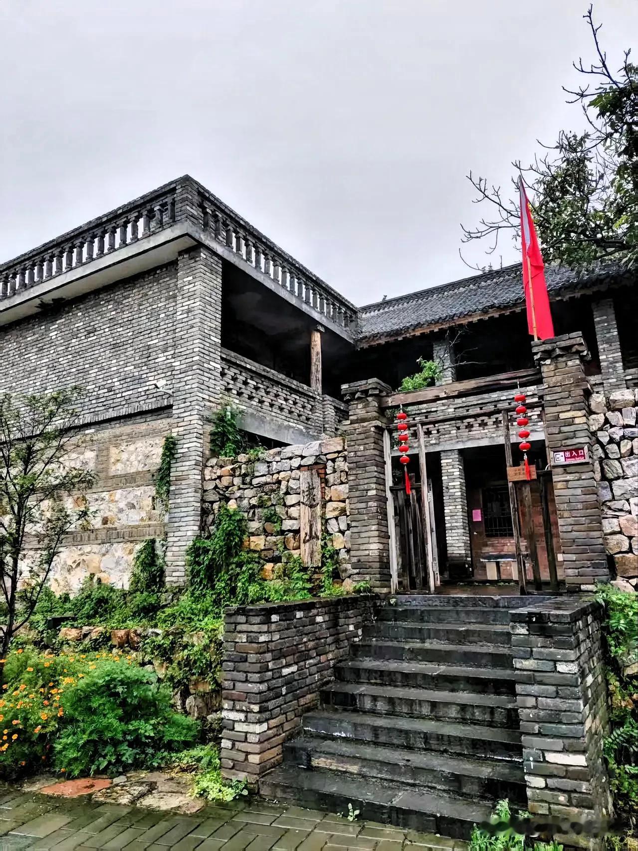 这里青砖石墙,在细雨中晕染开古朴的色调。这座老建筑,砖石交错的肌理里藏着岁月的故事,木质廊檐的斑驳处印着时光的足迹。 石阶蜿蜒而上,两旁绿植葱郁,几簇黄花点缀其间,添了几分灵动。红灯笼与红旗在微风中轻晃,传统与时代的气息在此交融。 它像一位沉默的老者,伫立在这片土地上,用砖石的语言诉说着过往的喧嚣与如今的宁静,每一道纹路都是历史的注脚,引着人去探寻那些被时光尘封的记忆。