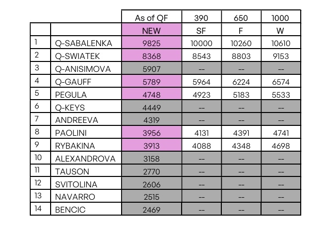 👉四位球员争夺最后三个席位:佩古拉、米拉·安德列娃、鲍里妮和莱巴金娜。