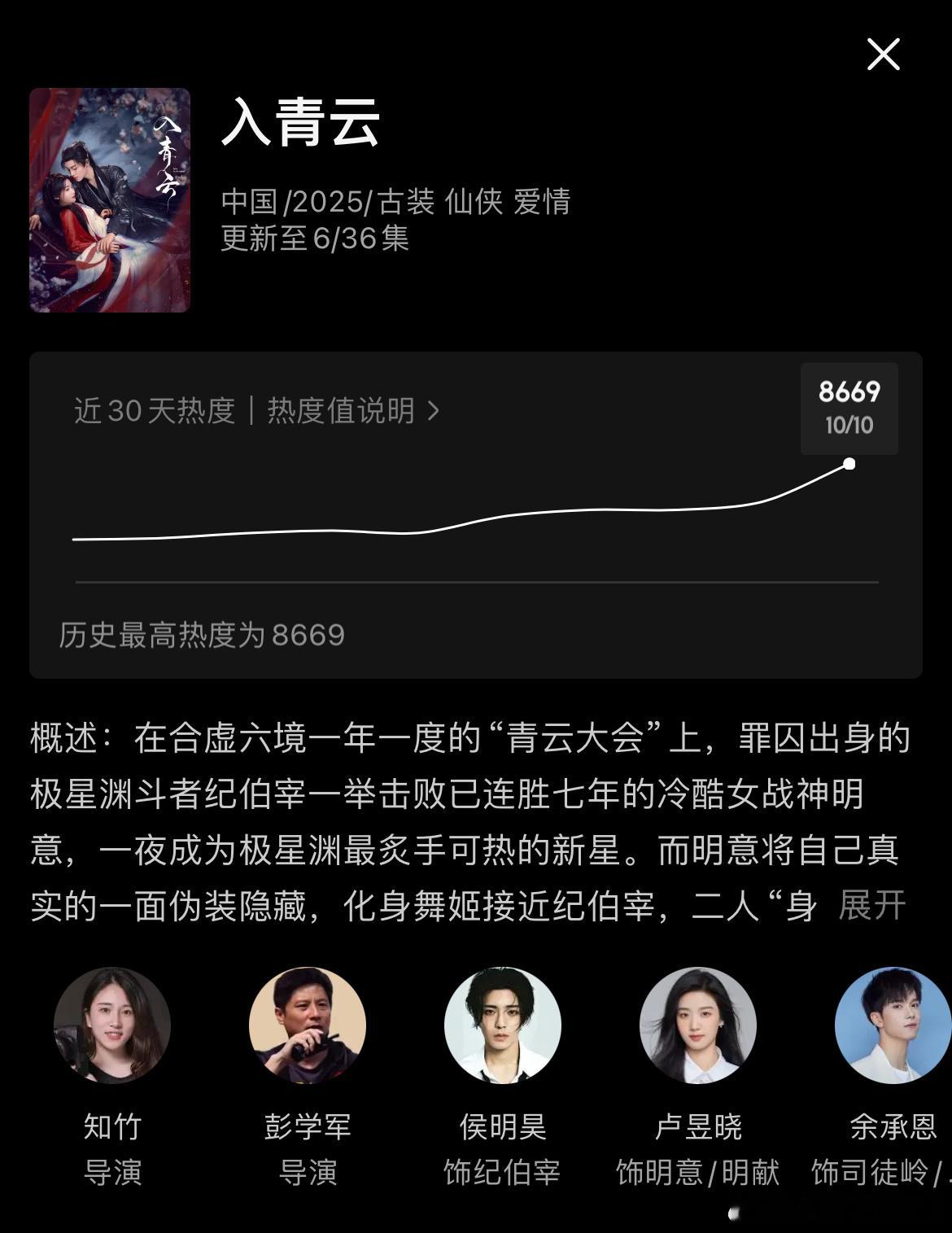侯明昊、卢昱晓入青云 开播次日优酷热度破8500,预计播放量1350w上下
