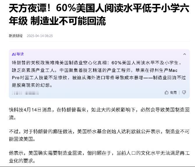 美国桥水基金创始人爆料,老美制造业无法回流不是因为受教育程度高,不愿意干!而是因为美国60%人口受教育程度低于小学六年级,干不了!精英永远在哪里都是少数啊!这事儿听起来夸张,但细想还真有点道理。 达利欧这说法听着夸张,其实一点不假,美国制造业回不来根本不是人家不愿干,真是没那本事干!别听那些“高学历不愿进厂”说法,事实就是底层劳动力文化水平太差,根本接不住制造业的活。 先说说达利欧那60%的数儿哪儿来的,是美国国家教育统计中心有数据,21%的成年人是功能性文盲,意思就是连复杂点的说明书都看不懂,填个表格都费劲;还有43%的人阅读能力就到小学五六年级水平,这两拨加起来都64%了,达利欧说60%其实还往少了说。 而且OECD的调查也证实,美国成年人的阅读和数学技能比好多发达国家都落后,15岁学生的数学成绩全球排26名,这基础教育能好才怪。 再看实际工厂的情况,这才是最实在的,特斯拉上海工厂的效率是加州工厂的三倍,为啥?不是美国工人懒,是中国工人学技术快,美国工人连设备操作手册都啃不明白。 富士康之前在威斯康星建工厂,花半年培训美国工人,结果合格率还不到中国工人的三分之一,最后项目黄了,这总不能赖人家不愿干吧?开利集团招工人,20份申请里可能就1份符合要求,人家董事长都明说了,不是没人来,是来的人根本不行。 苹果之前想在得克萨斯州产Mac Pro,最后搞不下去,核心原因就是找不到合格的工人,连本土供应链都凑不齐,这难道是工人挑活? 有人说“给高工资不就有人干了”,这话太天真。 美国制造业工人工资已经是越南的6倍了,可还是招不到人,问题根本不在钱上,在人身上,制造业早不是以前光卖力气的活儿了,现在的工厂都用复杂机器,哪怕是拧螺丝都得懂点技术参数,不是随便拉个人就能上的。 美国制造业协会说,一半的空缺岗位至少要学士学位,就算剩下的不用学历,也得会用机器吧?可大街上找不着这样的人啊。 波音公司培训新员工认游标卡尺,以前3天就行,现在得花两周,不是教得差,是工人基础太差,连初中数学都跟不上。 更要命的是美国教育的分裂,真是把“精英少数”这点体现得淋漓尽致,1%的人上常春藤名校,搞精英教育,掌握着科技金融的核心,但剩下的99%接受的是“快乐教育”,说白了就是糊弄事儿,好多人高中都没毕业就进社会了。 你想啊,顶级私立中学生均经费5万8千美元,比98%的制造业企业研发投入都高,而社区学院一年才8900美元,连哈佛的七分之一都不到,这教育质量能一样吗?底特律的工厂都得自己开数学补习班,因为招来的工人连基础分数计算都不会,这制造业能搞起来才怪。 别被“美国人不愿干体力活”的说法骗了,其实不少人想进工厂,美国有1750万低薪服务行业工人,时薪才13到16美元,而制造业能给到18到30美元,谁不想挣得多点?他们是真想去,但没那个技能啊。 卡托研究所的民调也显示,80%的人觉得制造业多招人对国家好,但只有25%的人觉得自己能胜任,这差距多明显,不是不愿干,是干不了。 还有人说用机器人替代人工不就行?那也得有人会操作维护啊,美国工业机器人数量比韩国都少,培养一个技师成本极高,台积电在亚利桑那的工厂要招2000人,本地没人,只能从台湾外派,每人培训成本就得5万美元。 这还只是高端制造业,像纺织业这种中低端的更惨,美国纺织业就业从60万跌到12万,10个岗位4个空着,因为没人会那些基础的缝纫、织布技术,职业教育覆盖率才15%,跟德国的50%、中国的40%根本没法比。 美国政府还瞎捣乱,一边喊着制造业回流,一边打击移民,要知道以前制造业的好多岗位都是移民填的,现在把人赶走了,劳动力更缺了。 搞关税战让原材料成本涨了不少,企业本来就招不到人,成本还高,更没法干了,制造业协会主席都说了,得先改变大家对工厂的老印象,但问题是就算印象改了,没人有技能还是白搭,总不能让工人空着手去开机器吧? 现在美国制造业空缺岗位快50万个了,还在往上涨,这缺口根本补不上,那些说“精英不愿干”的,纯属找借口,精英本来就不是干流水线的,制造业需要的是庞大的、有基础技能的劳动力群体,可美国这60%的人连小学六年级水平都不到,怎么补?功能性文盲就有3200万,每年造成2.5万亿美元损失,这可不是小事。 达利欧说得太对了,精英在哪儿都是少数,但制造业靠的不是少数精英,是千千万万能看懂图纸、会用机器、算得清数据的普通工人。 美国现在是精英在实验室里设计得再好,到了工厂没人能造出来,这种撕裂才是制造业回不来的真原因。 所以别再说什么不愿干了,看看那些工厂的招聘难、培训难,就知道是真没本事干,这制造业回流,纯粹是喊喊口号罢了。 参考资料: 环球时报《美制造业回流遭遇“用工荒”》