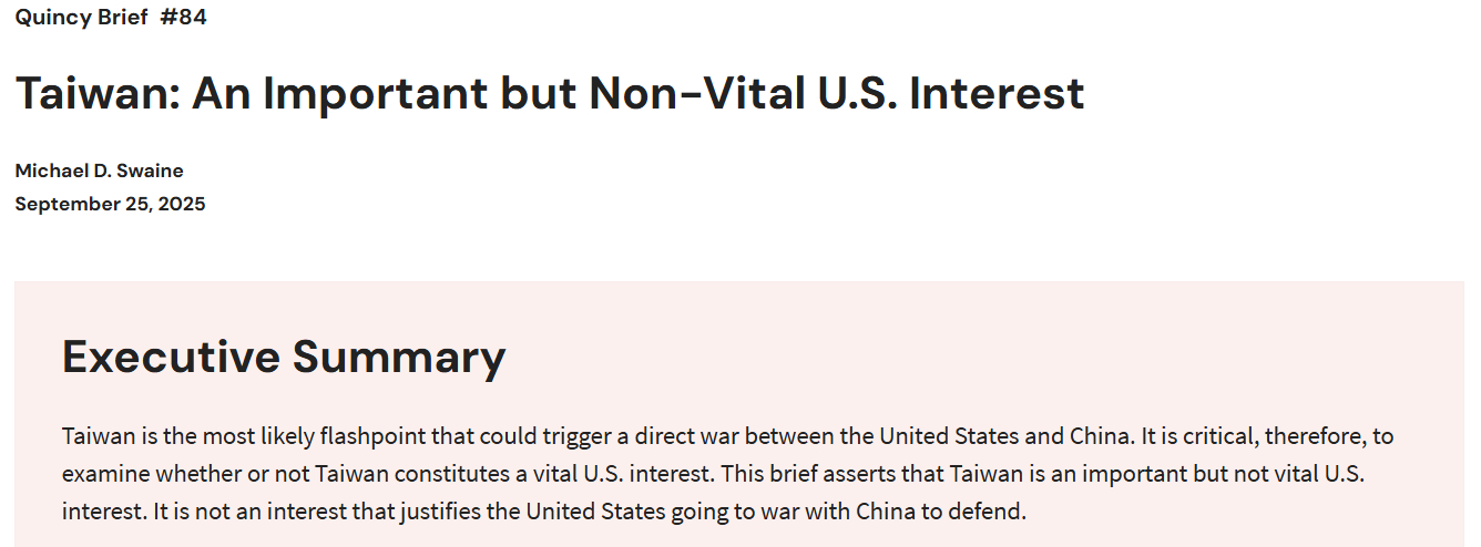 1. 作者史文(Michael D. Swaine),美国昆西研究所的高级研究员。他写了两个报告,第一份是《台湾是重要但非至关重要的利益》,第二份是《超越战略模糊:在不承诺战争的情况下支持台湾》。意思就是为台湾打仗不值得,也打不赢。美国方面这样的理论准备会越来越多。