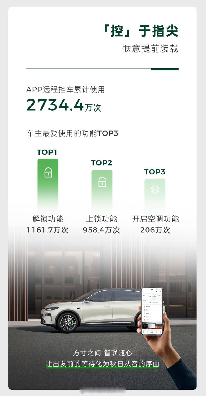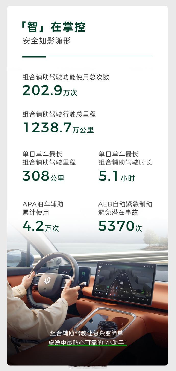 -组合辅助驾驶功能使用总次数202.9万次,总里程1238.7万公里,APA泊车辅助累计使用4.2万次;
