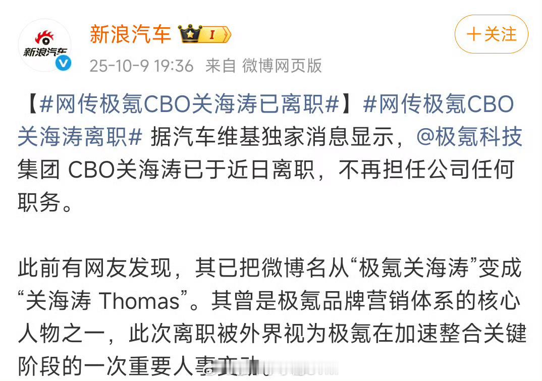 网传极氪CBO关海涛已离职看了一下,虽然从极氪关海涛变成了关海涛Thomas。但