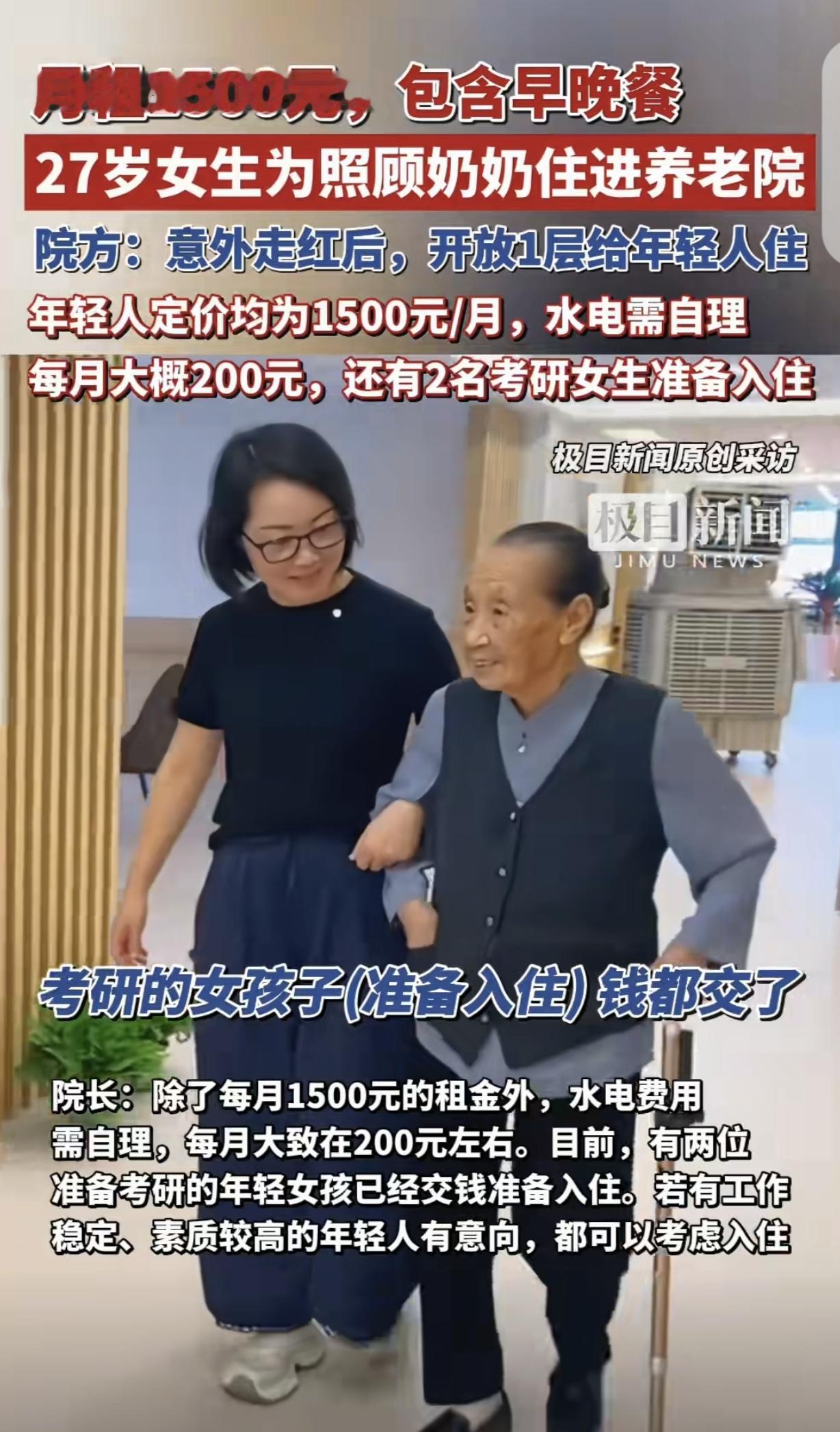 浙江,一27岁女子,年纪轻轻竟然每月花1500元,住进养老院,养老院管早晚餐,水电自理每月大概200元,而老年人入住,每月却平均花3000元,这是怎么回事?背后的原因,让人动容。 这天,一女子接到住在养老院奶奶的电话,可能奶奶想她了,也可能奶奶太孤独了,她老人家对女子一番嘘寒问暖,最后吞吞吐吐的问女子,是否愿意住进养老院陪着她。 女子眼睛瞬间湿润了,从小到大,奶奶在她成长过程中,给了她无尽的爱。 都说你养我小我养你老,但现实是残酷的,她不能为奶奶膝前尽孝,父母也有自己的难处,只能把奶奶送进养老院,她还要打拼自己的人生,就连给予奶奶陪伴和探望,都是奢侈的。 女子挂断电话后,想了很久,终于走进奶奶入住的那家养老院,找到院长,表达了自己想入住养老院,陪伴奶奶的想法。 虽然她早出晚归的工作,但下班后,起码能陪奶奶说说话,散散步,给她端茶倒水,给她泡脚捶背,让她能安享晚年,不至于孤苦伶仃。 院长被女子的孝心感动,因为女子的奶奶入住了,所以养老院决定给予女子优惠,让她每月1500元入住,管早晚两餐,但水电自理。 毕竟,养老院刚成立不久,6层楼空房间很多,房间空着也是空着,何不成全了女子的孝道。 女子开心入住,她住在了奶奶的隔壁,和奶奶一墙之隔,既有彼此独立空间,也能相互照料和陪伴,甚好! 女子把这件事发布网上,一下子火了,很多年轻人都有了入住养老院的想法,在外租房,房租一个月1500都不够,何况养老院管早晚两餐,水电费每月最多200元,太划算了。 养老院也来者不拒,甚至把一层楼空出来,专门接待年轻人入住,索性把价位就定为1500,一视同仁。 目前,已经有2个考研的女孩子把钱交了,准备入住养老院。 这个创意真好,年轻人有活力,很老人在一起,让老年人的生活更阳光充满希望,这个模式好,院长头脑清醒,一举三得。 这种模式好!安全卫生又环保。全当康养了。这和许多村镇办的农家乐有许多相似之处,值得推广。经济实惠,价格又接地气。在当下经济低迷,物价居高不下的大背景下,对人对事,只要有益,就可大胆尝试。 感觉以后这种养老院很有发展前景,可以尝试多开办一些如此多元化的康养机构。 这听起来很奇吧也很新奇。但这女子也很聪明,1500住进去,服务不错,居住环境不错,价格比在处面租房价格低。养老院有空床位,不论谁来都可入住,也被免空房间造成浪费,也是增加入住率的新形式和新办法。 管吃?不管吃的话,1500也不便宜,主要是老人院提供的服务,年轻人并不需要,反过来还要遵守老人院的相关规定!可能还要跟别人一起住一个房子。 这个养老院办的好,很受年青人的喜欢,一有房住,二不用做饭,每月1500元,好事。 但传统很多老人不愿意住养老院,认为住养老院是子女想抛弃他们,对他们不好。还有就是亲戚也会说。从道德上绑架。其实养老院环境好,又专业。 其实由于现在老人众多,应该探索更多的养老模式,为老人养老提供方便和实惠,像这个养老院的做法也是一种很好的方式,既减轻了工作人员的工作量,还让老人的亲情得也延续 很好 值得推广。 《民法典》第5条规定:民事主体从事民事活动,应当遵循自愿原则,按照自己的意思设立、变更、终止民事法律关系。 27岁女子与养老院签订入住协议属于双方自愿的民事合同行为。尽管养老院通常以老年人为主要服务对象,但民法典未禁止其向其他年龄群体提供住宿服务。 养老院基于空置房间资源利用和促进代际互动的目的,以每月1500元的价格接纳年轻人入住,属于对自身经营权的合法行使。 只要双方对租金、服务内容,如早晚两餐,达成合意,且未违反法律强制性规定,如歧视性条款,该合同即受法律保护。 养老院对年轻人和老年人的收费差异,1500元 和 平均3000元,看似悬殊,但其具备正当性。 老年人需要全天候护理、医疗支持等专业服务,年轻人仅需基础住宿和餐饮,成本差异显著。 空置房间以优惠价出租给年轻人,避免了资源浪费,同时通过“陪伴型入住”间接提升老年人生活质量,符合效益最大化原则。 《老年人权益保障法》第13条规定:国家和社会应当采取措施,健全保障老年人权益的各项制度,逐步改善保障老年人生活、健康、安全以及参与社会发展的条件,实现老有所养、老有所医、老有所为、老有所学、老有所乐。 该养老院允许年轻人低价入住并鼓励代际互动,符合法律倡导的“老有所乐”原则。 女子入住后为奶奶提供日常陪伴,缓解了老年人因孤独导致的心理健康问题,实质上履行了部分家庭赡养义务,与《老年人权益保障法》第14条家庭成员关爱责任形成呼应。 养老院通过引入年轻人群体,丰富了服务形式,这种“互助型养老”模式未被法律禁止,反而符合鼓励社会力量参与养老服务的政策导向。 对此,你怎么看? 关注@灋律盐究员 学法辩是非,用法止纷争。
