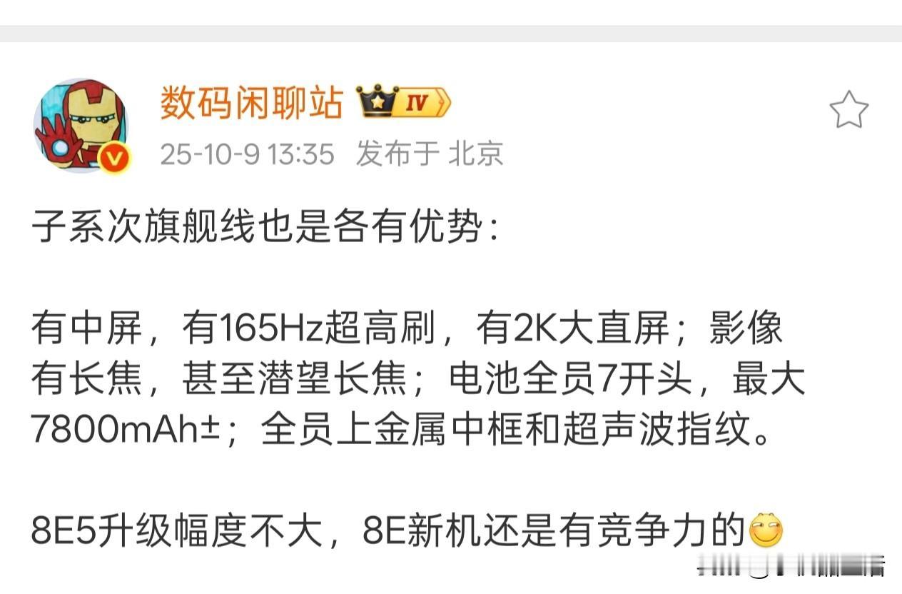 曝米OV子品牌开卷次旗舰机型:配备2K屏+7K电池+超声波 今日,知名数码博主“数码闲聊站”爆料称多家手机厂商旗下子品牌(REDMI、一加和iQOO)次旗舰产品线将迎来全面升级,进一步提升产品竞争力。 据透露,这些次旗舰机型在屏幕配置上各有侧重。部分机型将采用中等尺寸屏幕设计,兼顾握持感与显示效果;另有新机将配备165Hz超高刷新率屏幕;有的机型则配备2K分辨率的大尺寸直屏。 另外据爆料,该级别新机电池容量普遍进入“7000mAh时代”,最大可达7800mAh左右;全系标配金属中框和超声波屏下指纹识别技术;性能方面,搭载了高通骁龙8 Elite Gen5处理器。数码新机探讨
