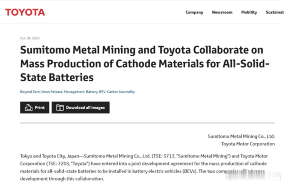 10月10日消息,近日,丰田汽车通过全球官网宣布,已与住友金属矿山株式会社达成合作协议——双方将围绕纯电动汽车(BEV)用全固态电池正极材料的量产展开协作。