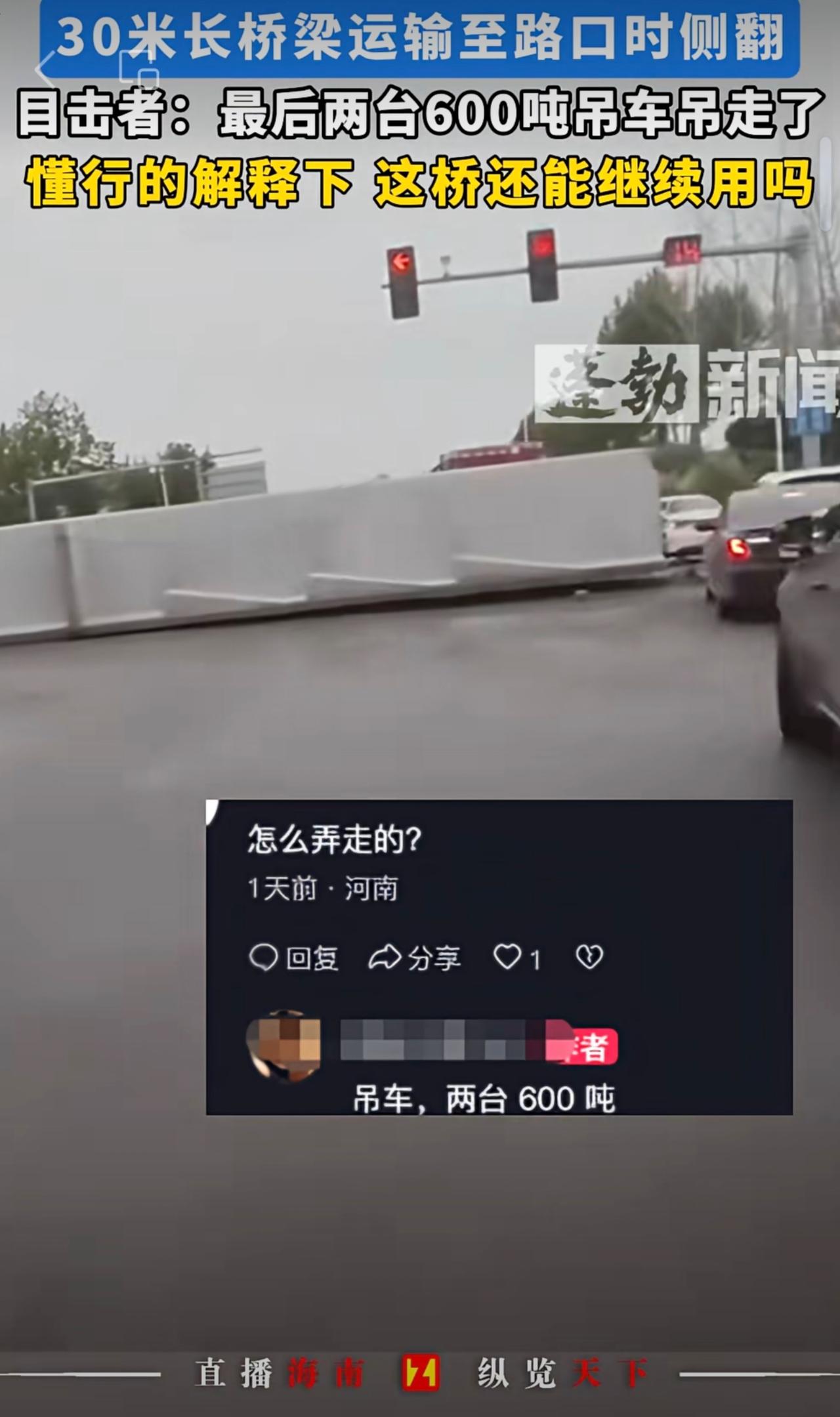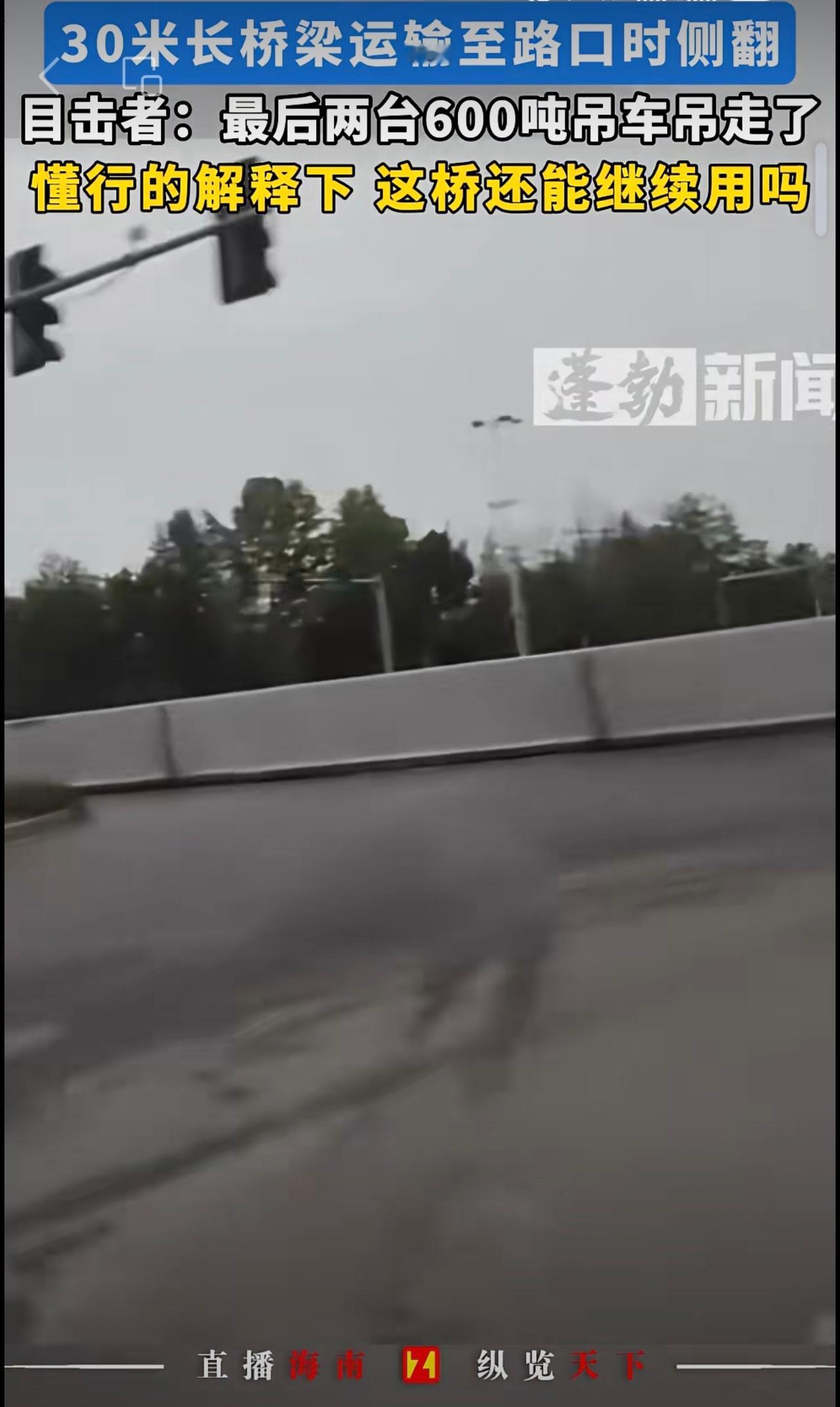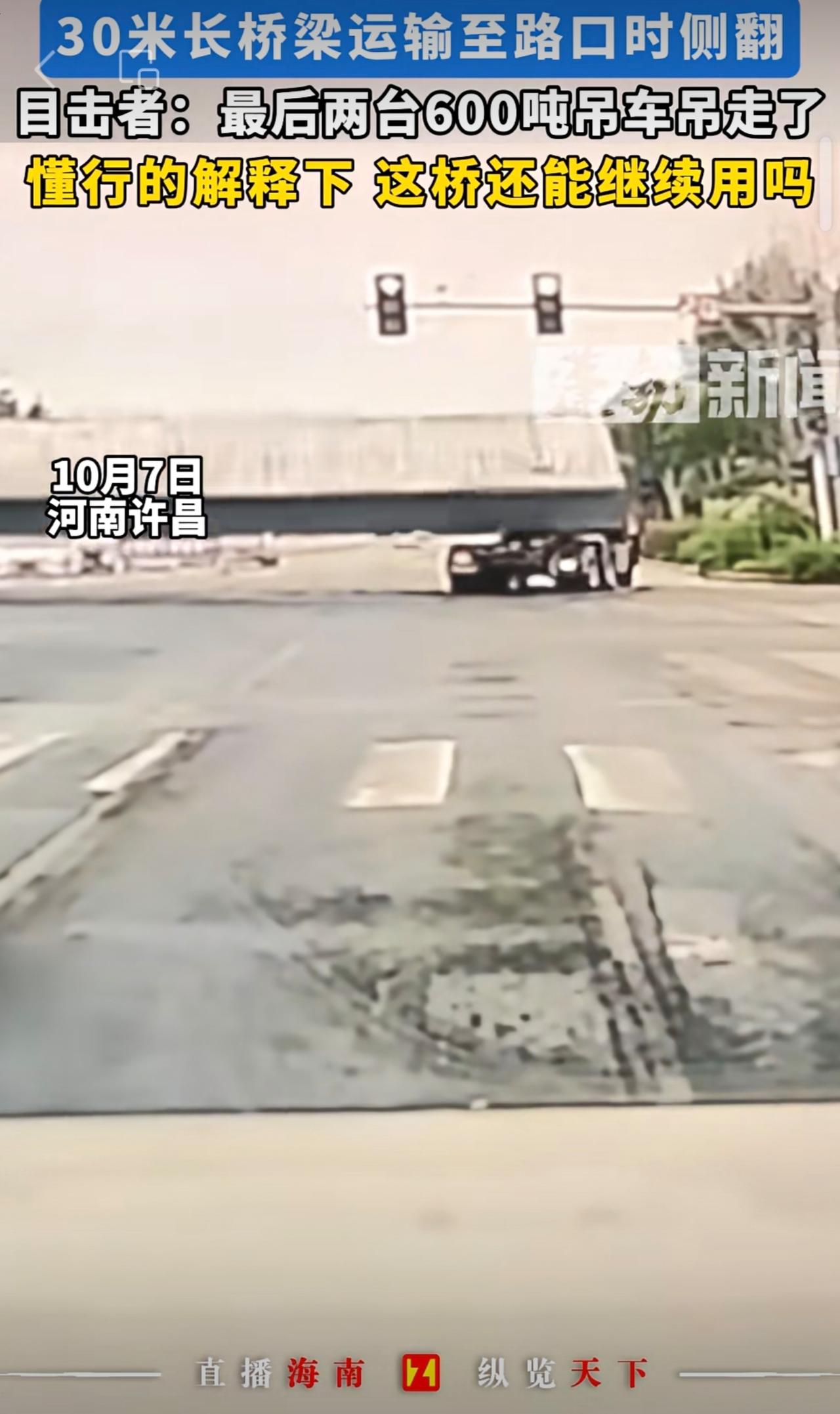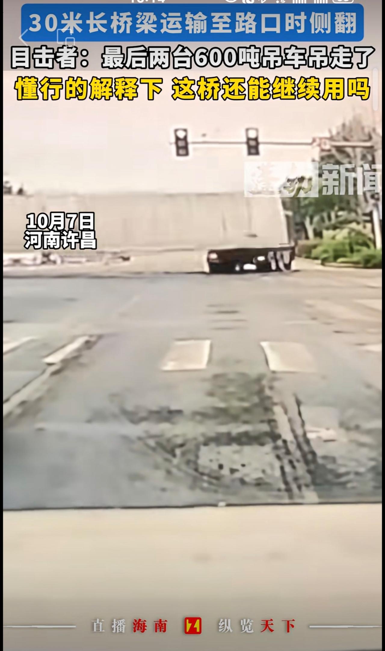 30米长桥梁运输至路口时侧翻,目击者:最后两台600吨吊车吊走了交通事故现场