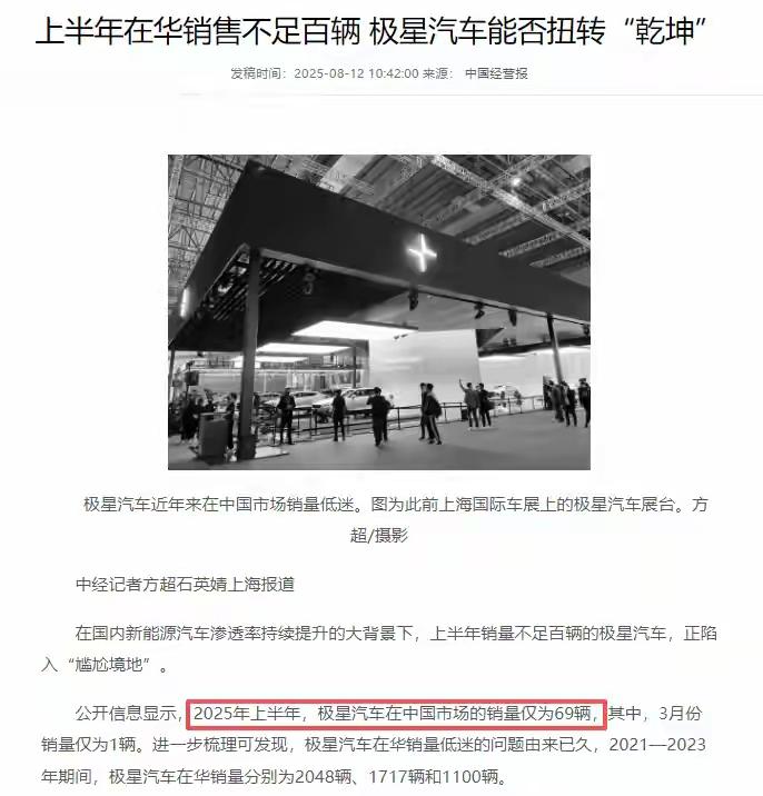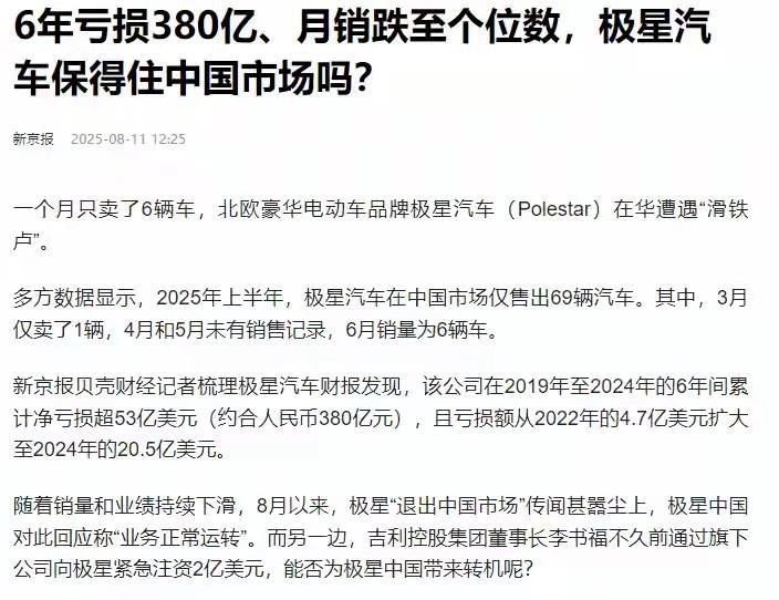 极星这情况,真让人捏把汗。上半年仅卖69辆,卖1辆亏27万,虽说又拿到中东土豪3.5亿美元,但怎么看都像在续命。对赌协议要求2026年毛利率转正,可它现在状况糟糕,极星6超跑项目砍了,极星4交付推迟,入门新车生产线都没定。 不过它“断尾求生”也有自己的节奏。欧洲Q2销量靠企业采购涨了12%,美国网约车平台租走2万辆清了库存,澳洲、新西兰市场也有起色。但要撑过2025年,还真不好说,毕竟市场竞争太激烈,它得赶紧找到盈利之道。 上半年仅售69辆,卖1辆亏27万,“车圈顶级富二代”能撑过2025吗 当2025年上半年中国新能源汽车渗透率突破51%,行业迎来集体狂欢时,极星汽车却交出了一份刺眼的成绩单:累计销量仅69辆,不足比亚迪单小时销量的零头,每卖出一辆车净亏27万元[__LINK_ICON]。这个由吉利与沃尔沃联手打造、头顶“车圈顶级富二代”光环的高端品牌,正站在生死存亡的悬崖边。 极星的崩塌并非一蹴而就,而是战略摇摆与市场错配的必然结果。2021年至今,品牌累计亏损已达337亿元,2024年单年亏损更是飙升至20.5亿美元,总负债突破73亿美元,净资产沦为-33.29亿美元,彻底陷入资不抵债的境地[__LINK_ICON]。资本市场早已用脚投票,其股价从上市时的10美元暴跌至1.09美元,市值蒸发91%,融资窗口基本关闭。 战略反复横跳是极星迷失的核心。首款车Polestar 1定价145万主打高端小众,次年Polestar 2突然降价至30万冲击大众市场,随后Polestar 3又跳回70万级豪华阵营,Polestar 4再降至34万区间。8年间更换7任中国CEO,每任领导都推翻前任策略,导致品牌形象模糊,消费者根本无法建立认知[__LINK_ICON]。产品层面的“水土不服”更让问题雪上加霜:Polestar 3国内定价比海外贵20万,Polestar 4被吐槽“换壳沃尔沃”,车机系统直到2023年才接入本土生态,还频频出现导航错位、广告牌误识别等低级问题。 如今的极星已显现全面溃败迹象。在线购车系统关闭,官方商城下线,曾经遍布全国的37家直营门店仅剩上海前滩一家展厅。2025年4月,品牌终止与星纪魅族的合资公司运营,50多名员工被裁,本土化团队几乎解散[__LINK_ICON]。销量崩盘传导至售后端,车主维修需排队两周,更换配件等待超一个月,甚至出现售后电话无人接听、保养预约石沉大海的情况。 为求自保,极星选择“逃离中国”。Polestar 4生产线迁至韩国釜山,Polestar 7转至斯洛伐克工厂生产,名义上避税,实则宣告中国业务全面撤退。欧洲市场成为其最后寄托,却同样面临危机:2025年上半年欧洲销量同比下滑14%,而特斯拉同期增长38%,优势已不复存在[__LINK_ICON]。 李书福6月自掏腰包注入的2亿美元,成了极星仅存的救命钱。但对于每月烧掉1-2亿美元的企业而言,这笔资金仅够续命1-2个月。沃尔沃早已减持股份至16%并停止输血,资本市场无人接盘,极星陷入孤立无援的绝境。 从年销2000辆到半年仅售69辆,极星的坠落印证了“富二代”光环救不了迷失的品牌。在新能源市场竞争白热化的2025年,缺乏清晰战略、产品脱离市场、服务体系崩塌的极星,若不能找到新的资金注入与破局之道,恐怕很难熬过这个冬天。曾经的豪华电动车梦,正在市场的残酷考验中逐渐破碎。