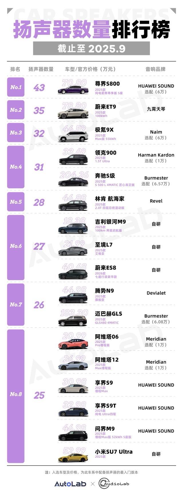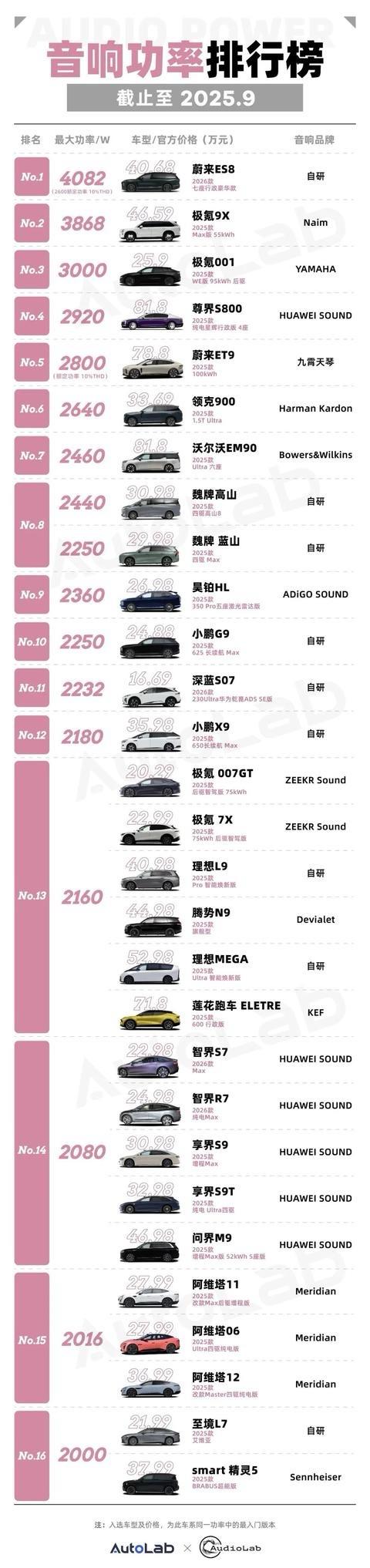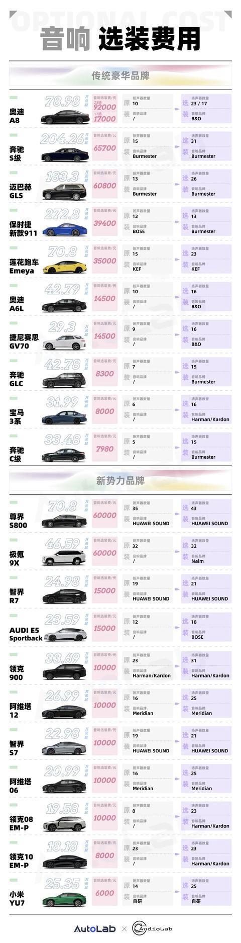 有钱选配个音响都快值一个车价了 看了autolab的评测数据对比来看,还得是咱们新势力车企的音响做的更好 没想到蔚来做音响这么牛逼,到底有何方神圣在支撑蔚来的声学[抠鼻][抠鼻] 其次就是领克大家族,都用上了豪华大音响,不过需要选配