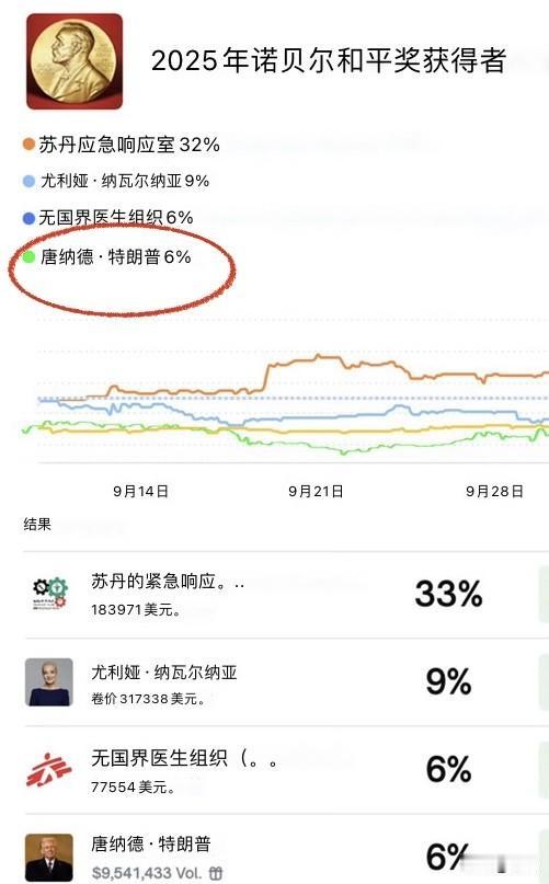 重磅!特朗普被预测排名第四获奖无望。众所周知,诺贝尔和平奖将于北京时间今天下午17时公布得主,然而,美国媒体公布的最新调查数据显示,特朗普获奖机率仅排名第四,尽管特朗普在多个公开场合毫不掩饰对获奖的渴望,然而,目前以色列、阿根廷,甚至美国《华盛顿邮报》仍在继续鼓吹特朗普应该获奖,并且强调“特朗普值得和平奖,诺贝尔和平奖配不上特朗普”,虽然如此,但尴尬的是除了利益方和特朗普本人正在利用其影响力继续互吹外,多位专家、相关分析机构和媒体均分析认为特朗普获得本届诺贝尔和平奖无望、最终仅有6% 的得票率可能。