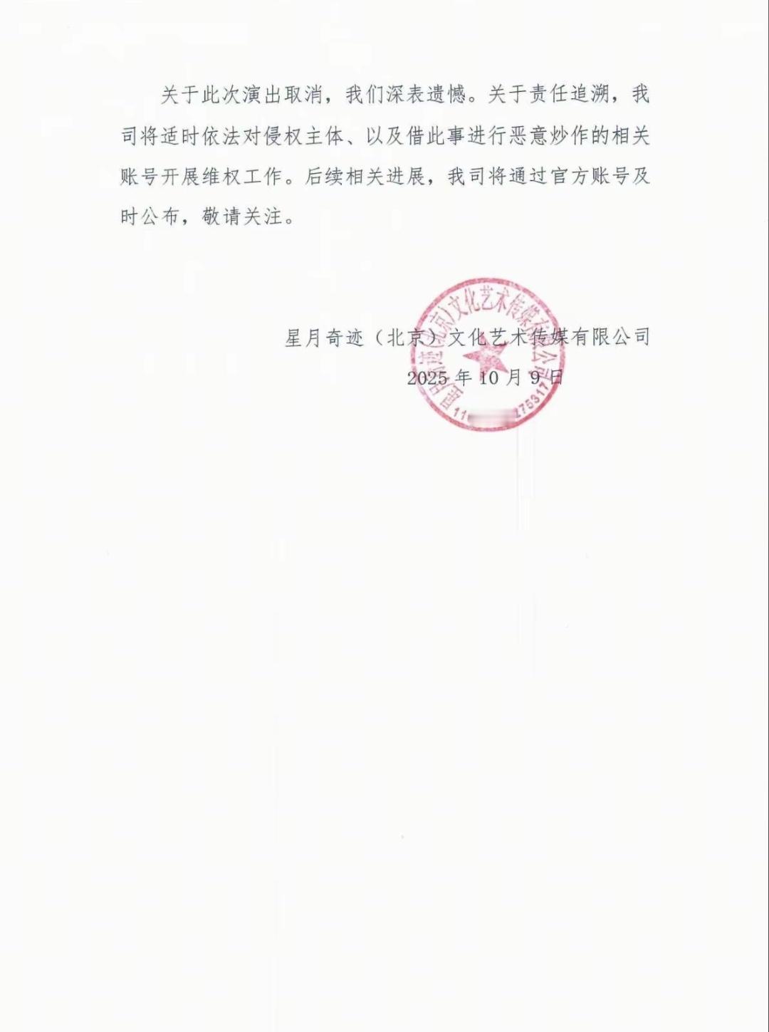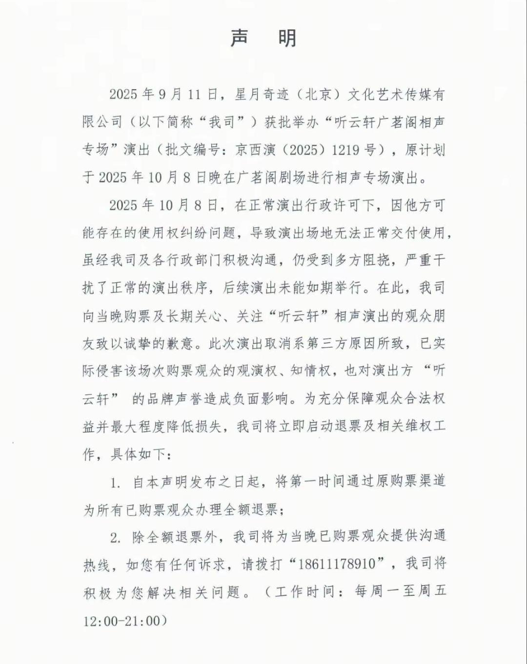 听云轩针对近期广茗阁问题的声明,有态度,有担当。 10月8日晚,听云轩原计划在广茗阁的演出未能如期举行,许多人看了现场直播或切片,网上一时议论纷纷。 针对这一事态,“听云轩”品牌所属方——星月奇迹(北京)文化艺术传媒有限公司10月9日通过“曹云金工作室”账号发表声明。 声明首先明确:原计划演出已经在9月11日获批举办,获批内容是“听云轩广茗阁相声专场”,批文编号“京西演(2025)1219号”。 紧接着简述了未能如期演出的经过,即:在正常演出行政许可下,因他方可能存在的使用权纠纷问题,导致演出场地无法正常交付使用,虽经听云轩一方以及各行政部门积极沟通,仍受到多方阻挠,严重干扰了正常的演出秩序,最终未能如期演出。 随即,很是真诚地向当晚购票以及长期关心、关注“听云轩”相声演出的观众朋友诚挚道歉,并指出此次因第三方原因取消的演出已经实际侵害了该场次观众的观演权、知情权,也对演出方“听云轩”的品牌声誉造成负面影响。 为此,公司承诺第一时间原渠道全额退票,并安排专人专线对接购票观众的任何诉求。同时,将适时依法对侵权主体、以及借此事进行恶意炒作的相关账号开展维权工作,并将通过官方账号及时公布后续进展。 综观此份声明,发布及时,内容到位,既表明了维护权益的坚决态度,也不回避应尽职责,尤其在保障购票观众权益的措施上具体且诚恳,充分体现了公司的担当与权责分明。 对于此事后续进展,我将持续关注。