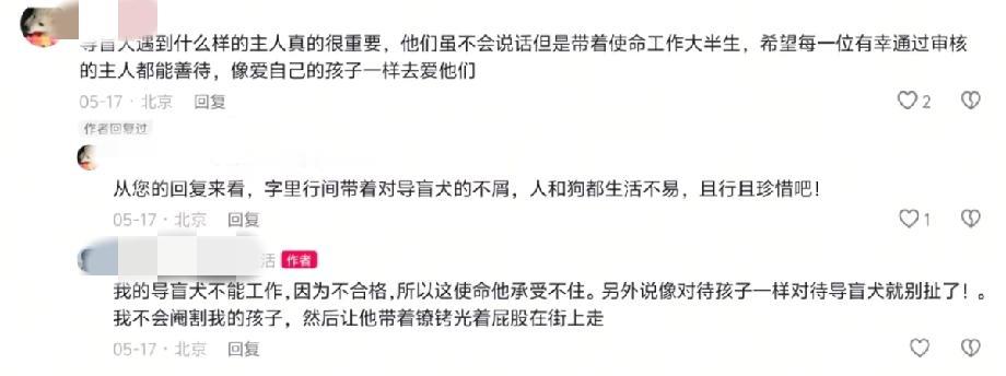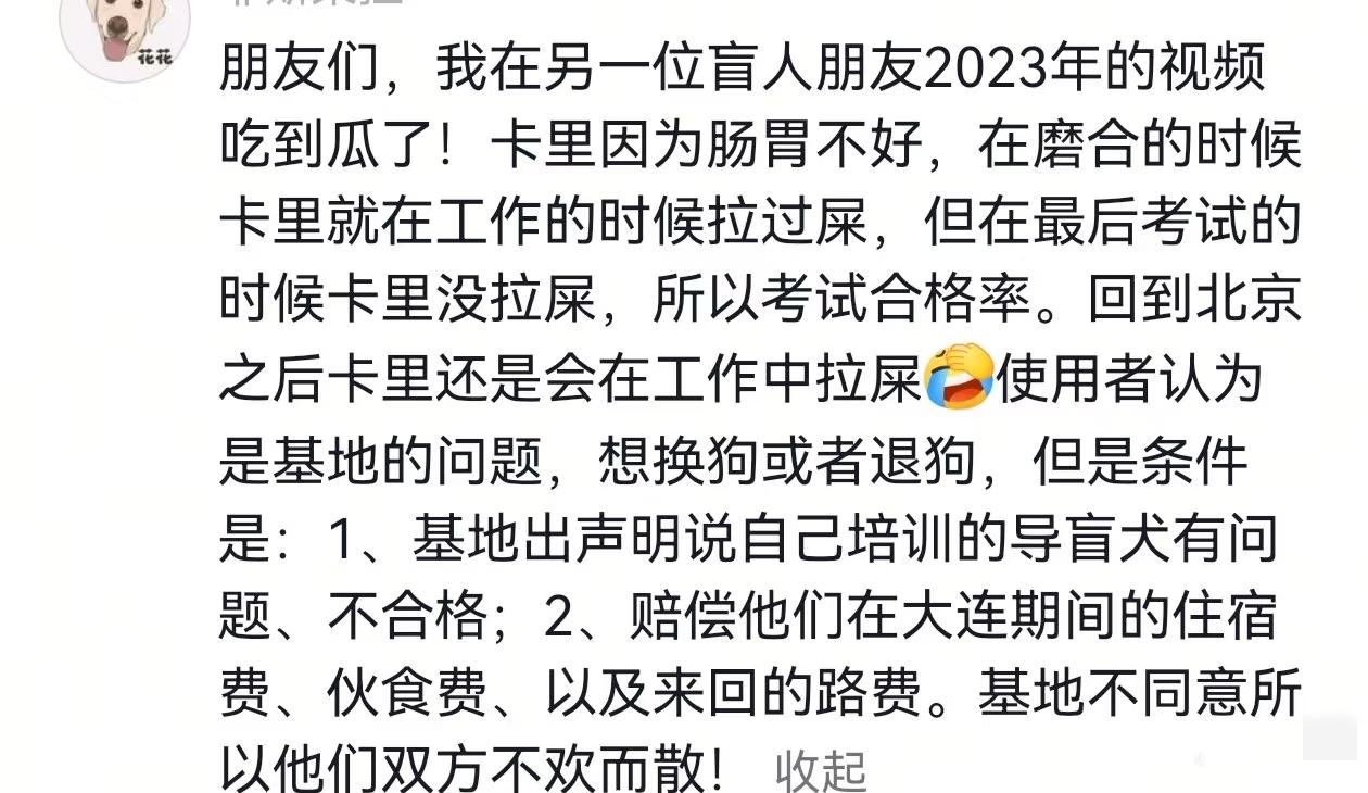 果然物以类聚是有道理的 相比导盲犬芬迪遭受的待遇 另一只黑色导盲犬卡里处境令人担忧 网友爆料卡里的主人23年就因卡里肠胃不好为由向训练基地索赔,失败后,开喷训练基地。还退不了,无所谓将就用!她发布的视频太多负能量,质疑,烦躁,不满。字里行间都是对导盲犬芬不屑。而且早在3月卡里狗狗,得了膝关节炎! 导盲犬作为盲人的眼睛训练是非常严格的,训练周期长达1-2年,淘汰率接近一半。 真的沒想过导盲犬的主人会是这种人,不把它们作生命看待,只是作为工具使用。