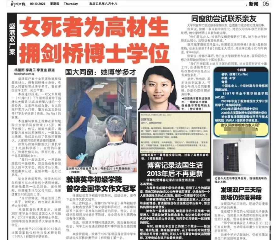 天花板渗出血滴,父亲已化为白骨,英国剑桥博士女儿饿死家中!最近新加坡曝出的一桩“离奇双尸案”,真相不是恐怖而是令人唏嘘…… 10月6日星期一,新加坡盛港公寓的一名阿婆忽然发现头顶天花板在渗水?等她仔细看清楚滴落的液体时更是吓了一跳——居然是带着恶臭的血水? 在阿婆的儿子上楼查看的时候,这一起震惊新加坡的案件才被曝光…… 警方在阿婆楼上的那个单位内,发现了两具尸体:70多岁的父亲在卧室内陈尸已然成了白骨!47岁的女儿徐娜倒在客厅门边,也已气绝多时! 如果不是尸体腐败后产生血水,从地板渗透滴落到楼下阿婆家中……这起双尸案还不知道会被隐藏到何时…… 两名死者是华裔,一家人是早些年从中国东北移民到新加坡,原本是一家三口,母亲在2016年因癌症去世后,剩下父女俩相依为命! 莫非,是因穷困潦倒导致的惨剧?其实不然! 根据目前媒体上能查到的信息,父女的死或许是一场意外,其“真相”令人唏嘘不已。 原来,47岁的女死者徐娜,学历傲人,2001年从新加坡国立大学计算机系毕业,又先后攻读了硕士,2008年获得英国剑桥大学博士学位。 徐娜应该属于高知家庭,她的父母都是研究人员,她则是中学时期从中国东北来到新加坡。媒体陆续找到了她的几个新加坡的中学同学,大家对她的第一印象就是 :成绩优秀,但是性格有些内向。 中学时期的徐娜,就曾经获得过1997年新加坡全国华文写作比赛第一名的成绩。 在同学们的眼中,徐娜成绩非常好,虽然有些内向,但是也不是完全封闭自己,她还很喜欢打乒乓球…… 据她的一位同学回忆,大约在20年前,他前往中国东北在地铁上偶遇了徐娜,并得知她在法国搞研究工作。 所有的回忆拼凑起来不难看出,徐娜是一个从小优秀到大的女孩,读到了英国剑桥大学的博士,这已经是非常了不起的成就,后来又在英国、法国等多国生活…… 这样一名顶尖的女学霸,为什么会和父亲一起惨死在家中,甚至要到了尸体腐烂渗出血水才被邻居发现的地步? 新加坡警方目前初步的推测,徐娜的父亲疾病身亡之后,徐娜是在家里活活被饿死的……你没看错,一个英国剑桥博士,被活活饿死在了家中! 从徐娜的工作履历来看,她在2009年至2012年间在法国国家数字科学与技术研究院担任科学研究员。自己的博客更新到2013年之后便没有了动静…… 看来,徐娜应该是遭遇了什么…… 这个疑惑,或许在邻居们的零星回忆中找到了答案——徐娜疑似患上了精神病! 邻居们说,自从徐娜母亲去世之后,父女俩就相依为命,但是很奇怪的是,并非女儿照顾父亲,而是年迈的父亲照顾起了女儿! 这对父女很少与邻居打照面,有时候面对面碰上也低着头快速走过,显得很神秘…… 而有邻居还曾看到,徐娜手舞足蹈口中念念有词的模样,和精神病人的状态非常相似! 在追踪徐娜的生活轨迹时间线,不难发现或许就是从2013年左右,她的身体出现了问题,四年之后与之感情深厚的母亲又患癌离世,徐娜或许受不了刺激……最终精神病发! 警方根据尸检认为,父亲可能早于徐娜一个月去世。 而患有精神病的徐娜,或许完全无法独立生活,失去了父亲的照顾,她最终在自己家中活活饿死…… 唉,这曾经是一名非常优秀的精英女孩啊,却最终落到了这样的下场! 徐娜在新加坡的一些中学同学目前已经得知噩耗,大家正在发动所有能量积极寻找徐娜在东北的家人……如果她还有亲人在这里的话。 这虽然是一起有些恐怖的“双尸案”,但是在了解了其详情之后,笔者只能是一声叹息! 这么优秀的女孩,被疾病折磨的只能靠年迈父亲照顾,最终还被活活饿死……在她人生最辉煌的时候,或许也曾收获过爱情,却终究抵不过其疾病复发。 人生的前三十多年,徐娜或许曾有过好多的梦想,也曾实现过无数的愿望! 可是,却在人生的最后十多年被精神病折磨,毫无声息的离开这个世界…… 造化弄人啊!