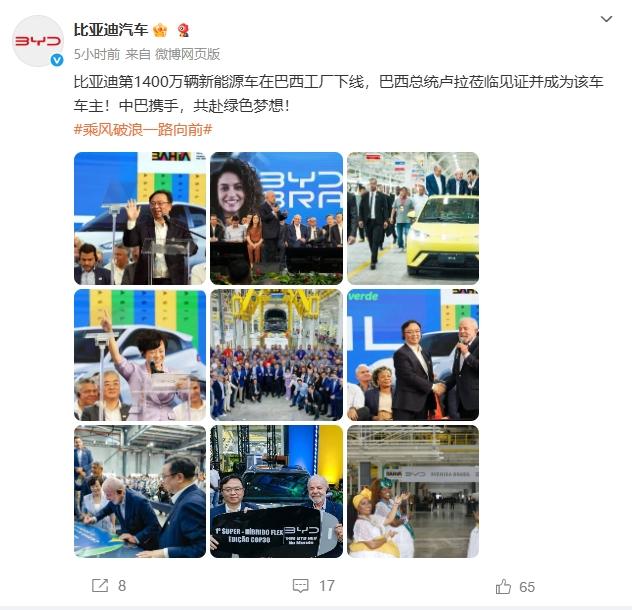 比亚迪第1400万辆新能源车巴西下线,卢拉总统亲自提车![666] 这可不是简单的交车仪式,这是中国汽车硬实力的全球秀场! 1400万辆新能源下线,比亚迪用实力说话。 巴西总统亲自站台还上手,这排面,还有谁? 比亚迪在巴西11年,17万车主,连续两年销冠,这次卢拉亲自下场当“车主”,这波文化输出+实力认证,直接拉满!