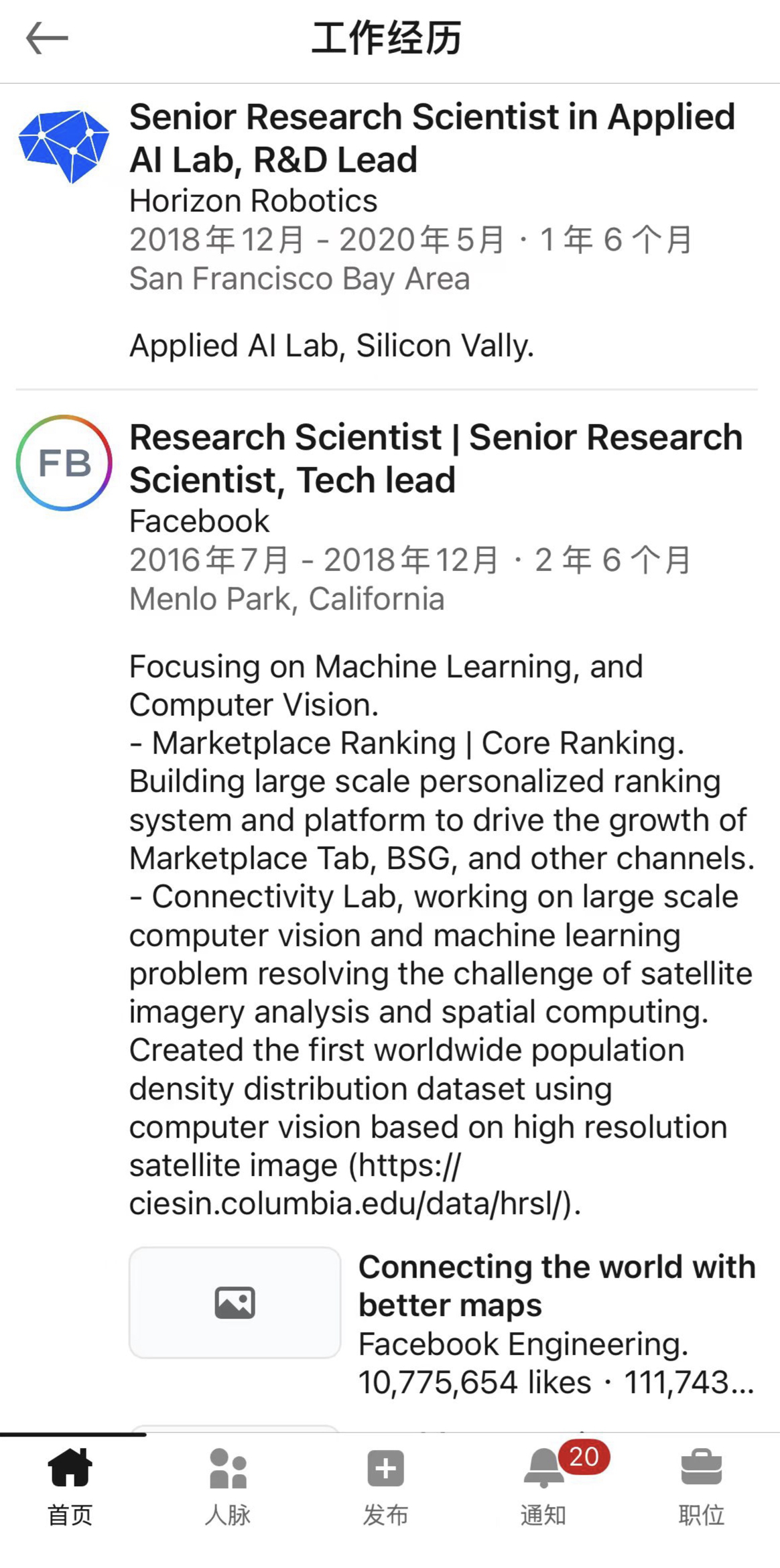 正儿八经的工作履历:2016-2018年在Facebook 做研究员
