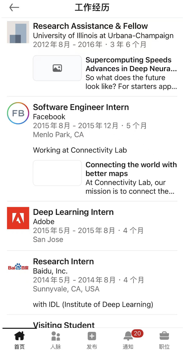 实习履历:百度、Adobe、Facebook的深度学习相关部门都待过几个月。