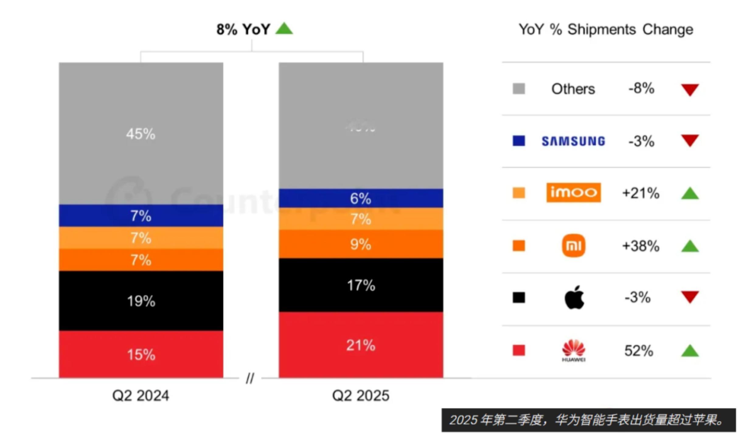 七年冠军换人了。2025年Q2全球智能手表出货3440万台,同比增长8%。华为交出720万台、暴涨53%,市占21%,首次反超苹果的580万台。