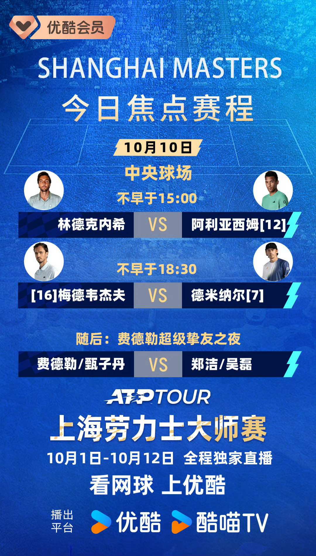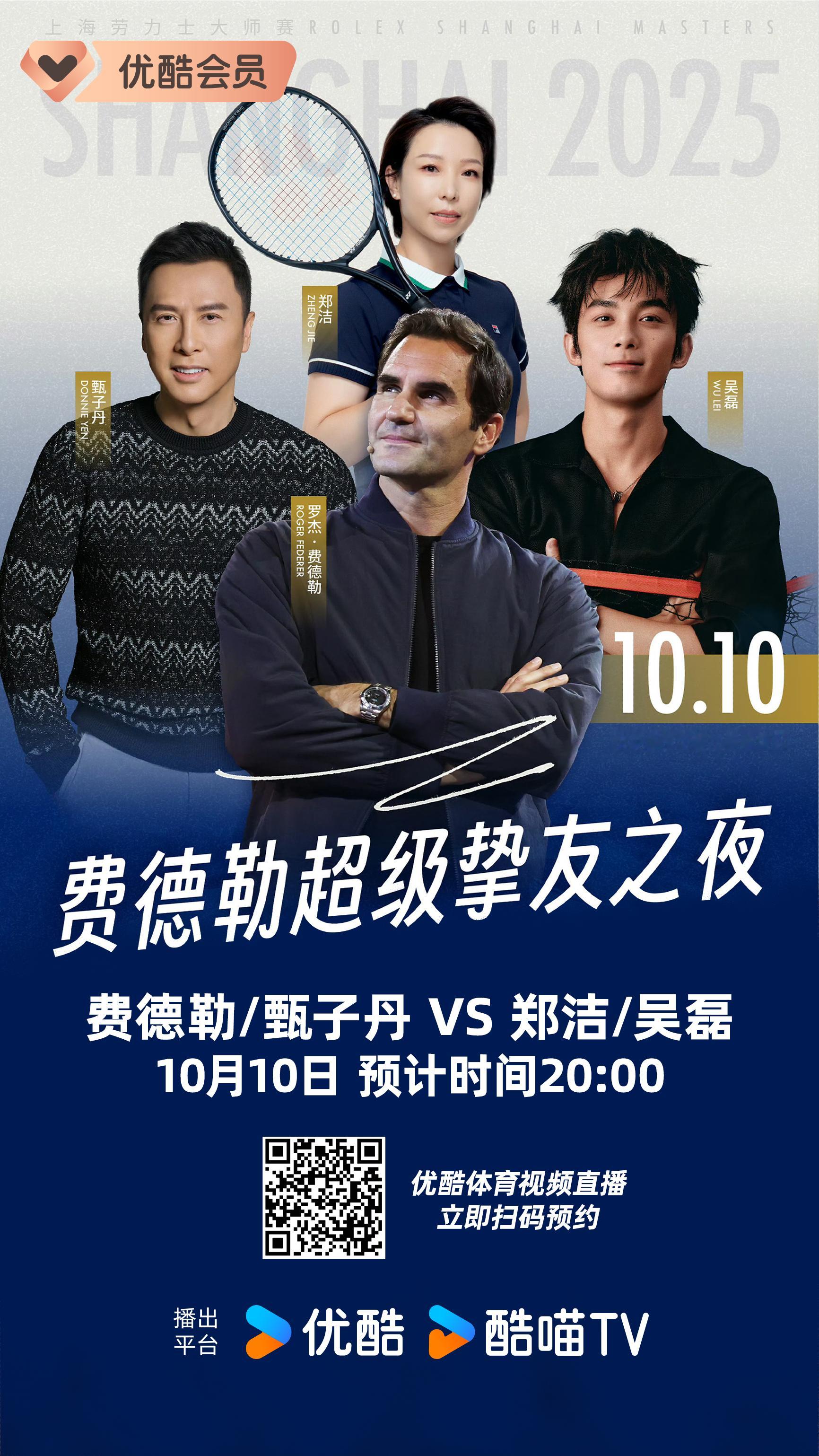 今晚约8点,优酷体育还会独家直播费德勒的“超级挚友之夜”,郑洁、甄子丹、吴磊亮相!